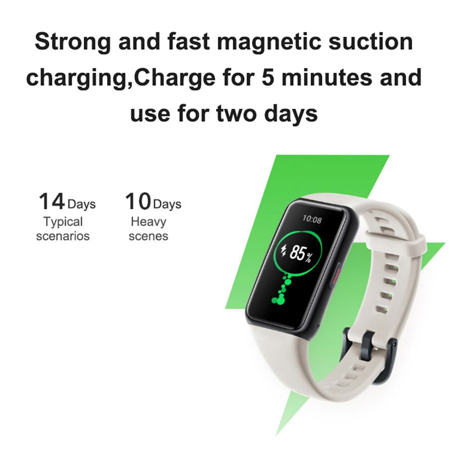 - Đặc biệt, Honor Band 6 còn có thời lượng pin rất ấn tượng lên tới 14 ngày, cũng như hỗ trợ sạc nhanh giúp người dùng sạc thiết bị trong 5 phút là có thể sử dụng được 2 ngày.