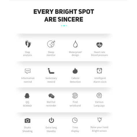 Chức năng: Huyết áp, Passometer, Sleep Tracker, Lịch, Push Message, Heart Rate Tracker, Đồng hồ báo thức, Tracker thể dục, Thông báo truyền thông xã hội, Tin nhắn nhắc nhở, Tuần, Call Reminder
