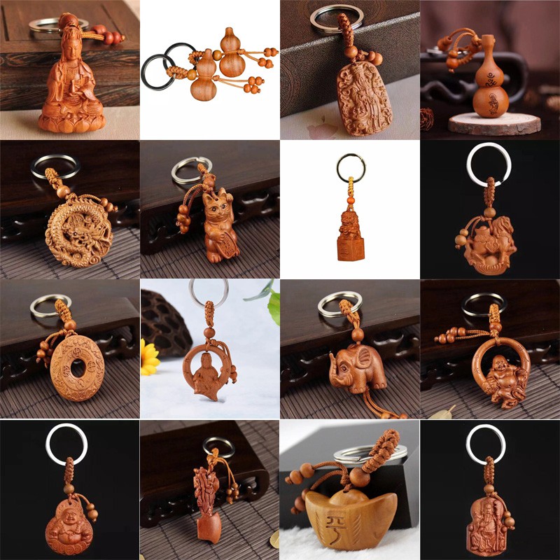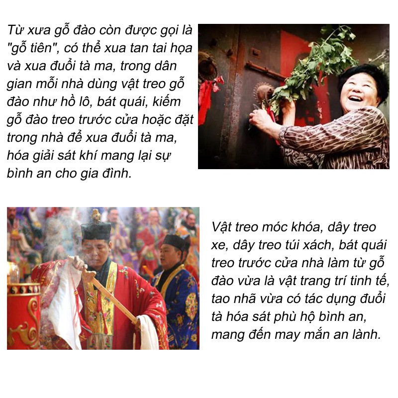 Từ xưa gỗ đào còn được gọi là "gỗ tiên", có thể xua tan tai họa và xua đuổi tà ma, trong dân gian mỗi nhà dùng vật treo gỗ đào như hồ lô, bát quái, kiếm gỗ đào treo trước cửa hoặc đặt trong nhà để xua đuổi tà ma, hóa giải sát khí mang lại sự bình an cho gia đình.Vật treo móc khóa, dây treo xe, dây treo túi xách, bát quái treo trước cửa nhà làm từ gỗ đào vừa là vật trang trí tinh tế, tao nhã vừa có tác dụng đuổi tà hóa sát phù hộ bình an, mang đến may mắn an lành.