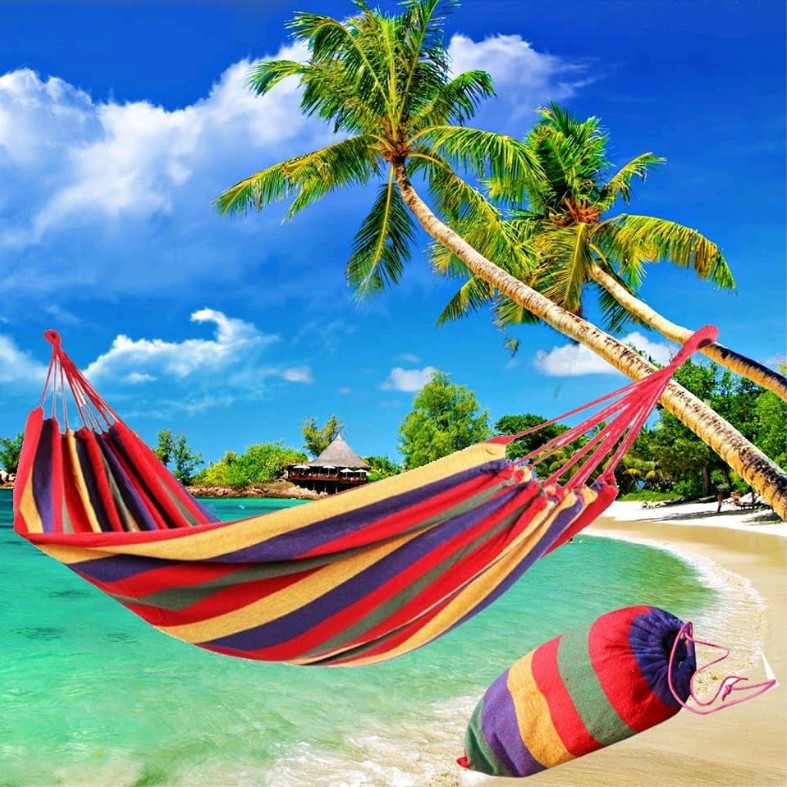 Võng Vải Dù Kẻ Sọc 2 Lớp Đa Năng - Võng Dù Du Lịch Cắm Trại Dã Ngoại Tiện LợiLà loại võng thích hợp nhất cho những ai thích đi du lịch, picnic, dã ngoại. Khi đi du lịch, cắm trại, đi bộ đường dài, thám hiểm những nơi rừng sâu, nơi mà những chổ ngủ, nghỉ ngơi, không còn đảm bảo an toàn do nền đất ẩm ướt, hơi ẩm thì chiếc võng du lịch là sản phẩm không thể thiếu.