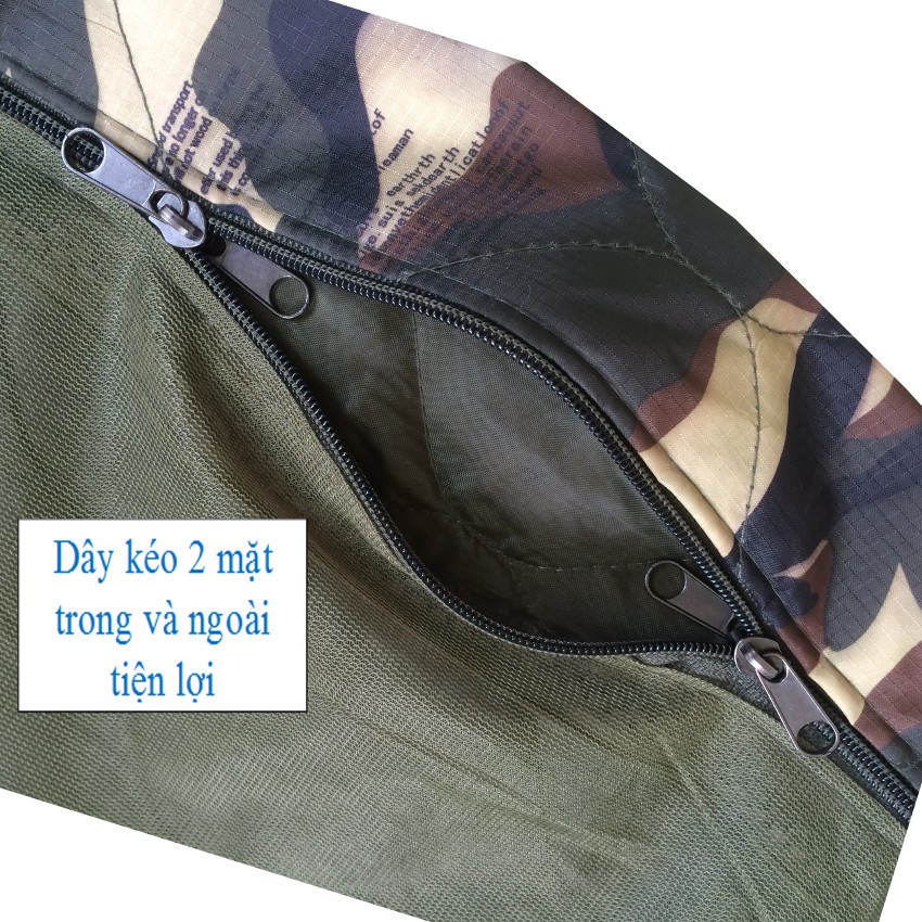- Chất liệu: mặt ngoài được làm bằng vải dù chống thấm nước tốt, ở giữa là 1 lớp mousse mỏng, mặt trong cũng được phủ 1 lớp vải mỏng. 3 lớp được may dính giúp cho khi nằm được êm và hỗ trợ giữ ấm. Vải làm mùng là loại vải mùng lỗ khít hỗ trợ chống côn trùng rất tốt.
