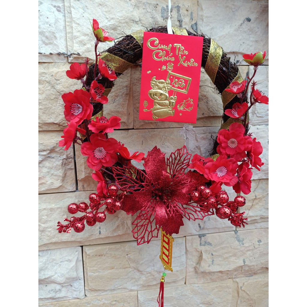 Vòng hoa đào, hoa trạng nguyên trang trị tết tông đỏ sang chảnhcó các tông khác cho khách nữa ạ