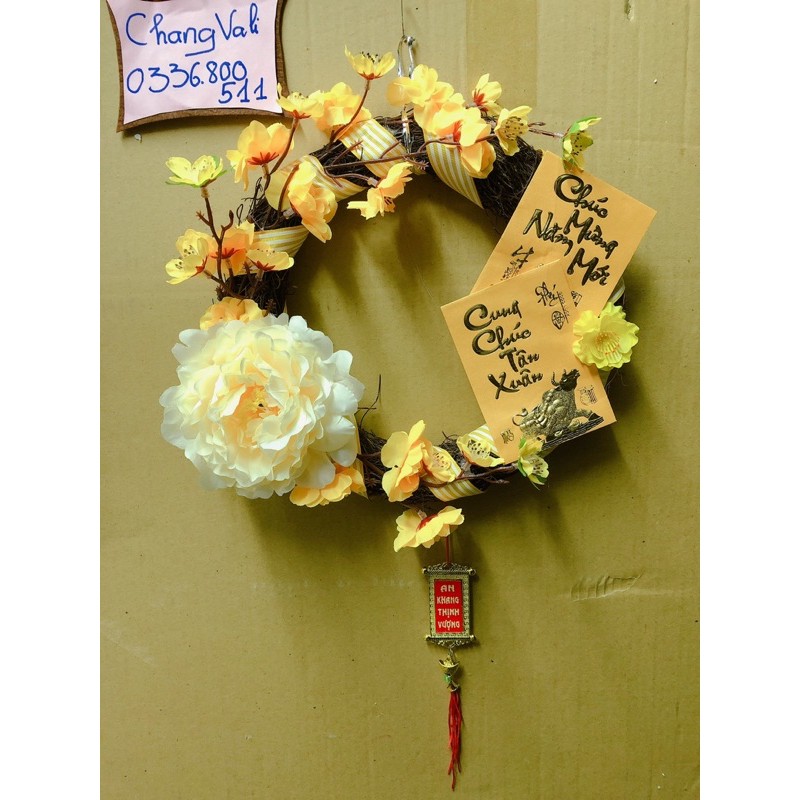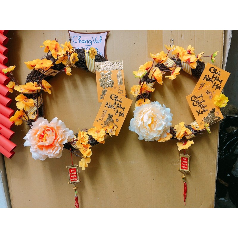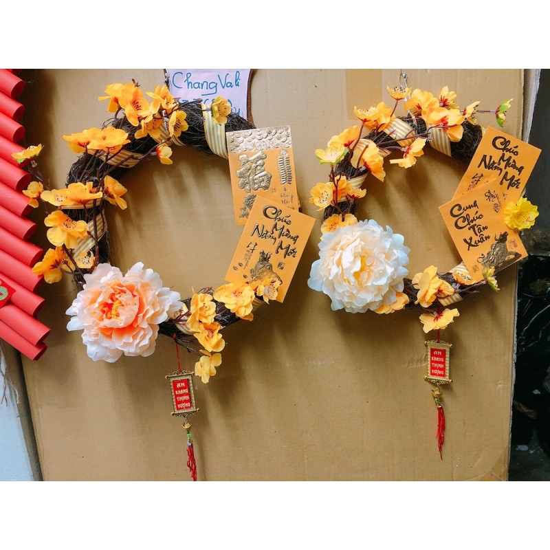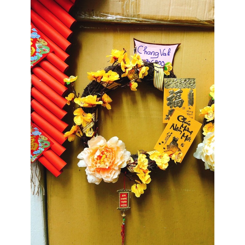Vòng hoa mai treo cửa trang trí tếtvòng dây rừng size 25cm , trang trí hoa mai , hoa đào , hoa mẫu đơn , lì xì và khánh , có dây treo