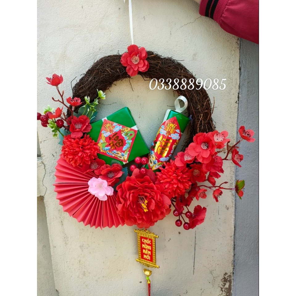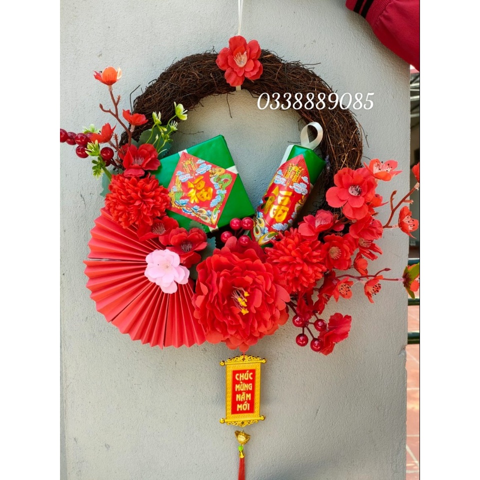 Vòng hoa đào, hoa mẫu đơn bánh chưng, dưa hấu trang trí tết 2022- Kích thước: vòng hoa đường kính 30cm trang trí y hình