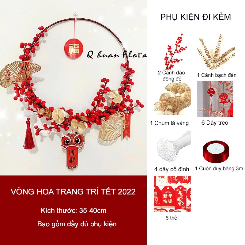 Giới thiệu Vòng Hoa Trang Trí Tết - Vòng Treo Cửa Tết 2022 Đào Đông Đỏ Decor Nhà Cửa Rước May Mắn, Tài Lộc (Hàng Cao Cấp Loại 1)