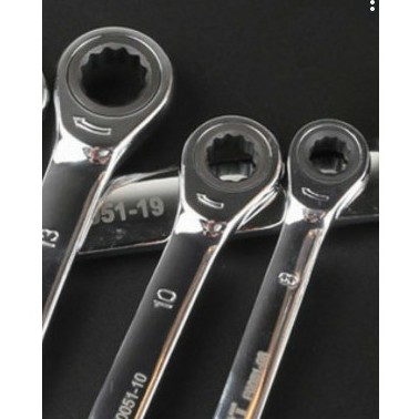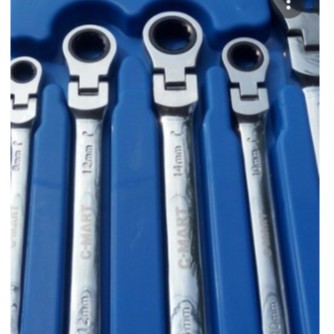 Chúng ta đã quá quen thuộc với các cờ lê một đầu vòng, một đầu miệng để mở ốc trong góc, trong khe hẹp đặc dụng. Tuy nhiên mỗi lần thao tác vặn lại phải nhấc lên để đặt lại vào ốc. Với cơ chế bánh cóc lắp thêm vào đầu vòng, ta có chiếc cờ lê vòng miệng tự động, không cần phải nhấc cờ lê lên mỗi lần vặn nữa. Bộ cờ lê vòng miệng tự động C-mart T0010 7 cây tập hợp đủ các số phổ biến hệ mét 8,10,12,13,14,17,19mm để đáp ứng công việc sửa chữa gia đình và xe máy xe đạp.
