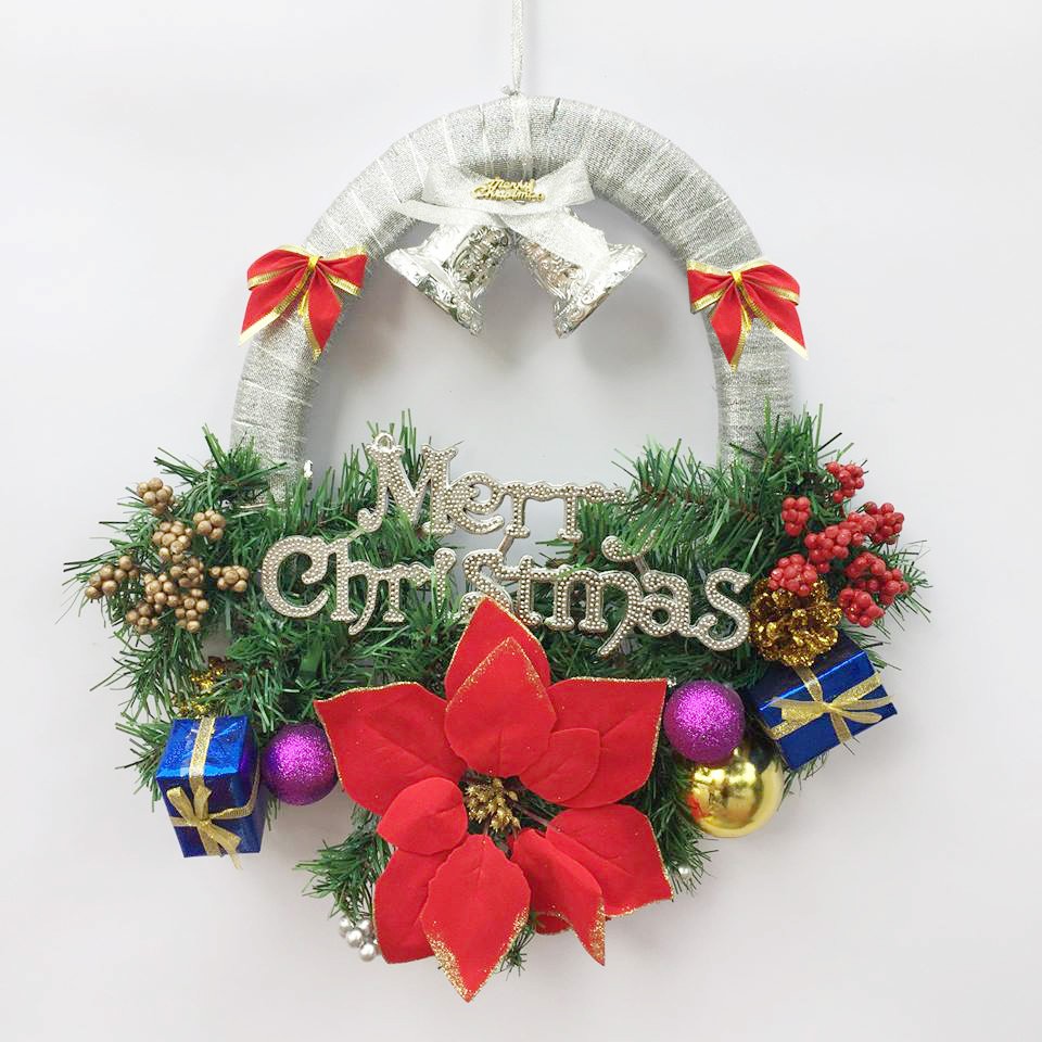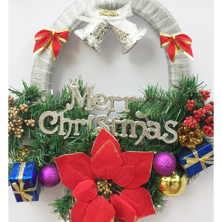 Vòng nguyệt quế trang trí Noel 38 x 38cmVòng được trang trí bằng những cành thông màu xanh, nơ, trái châu, quả thông và nhiều phụ kiện khác kết thành 1 vòng bán nguyệt trên nền 1 khung mây quấn ruy băng rất chắc chắn, ở giữa là 2 dòng chữ Merry Christmas .