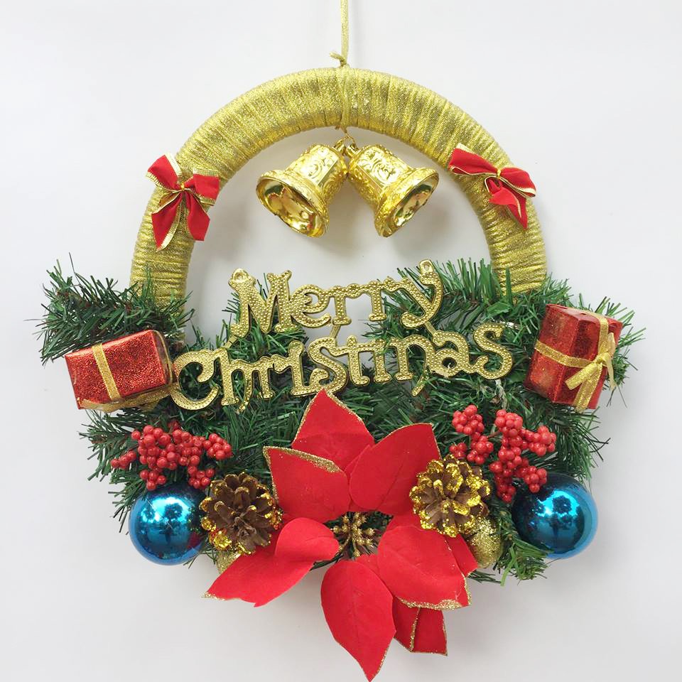 Vòng nguyệt quế chuông vàng trang trí Noel 40 x 40cmVòng nguyệt quế trang trí Noel 40 x 40cm được trang trí bằng những cảnh thông màu xanh, quả chuông, trái châu, quả thông và nhiều phụ kiện khác kết thành 1 vòng bán nguyệt trên nền 1 khung mây quấn ruy băng rất chắc chắn, ở giữa là 2 dòng chữ Merry Christmas .