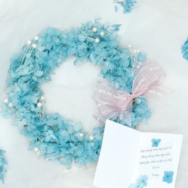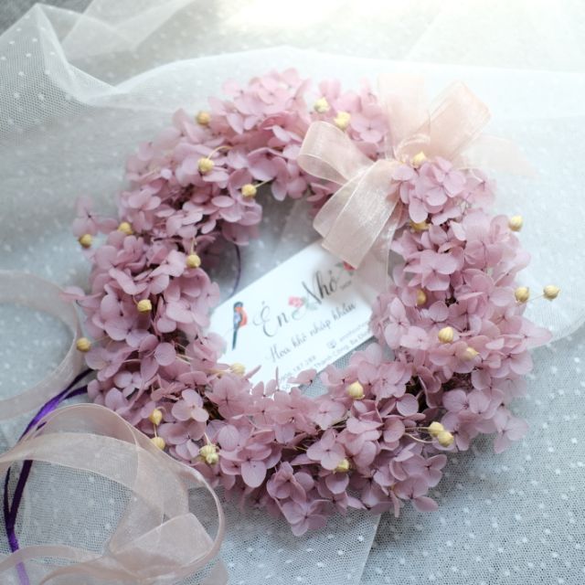 Vòng nguyệt quế hoa khô trang trí treo tường, cửa phong cách Bắc Âu siêu vintageVòng nguyệt quế được shop làm với 100% từ hoa khô cẩm tú cầu và được điểm bằng các loại hoa khô khác.