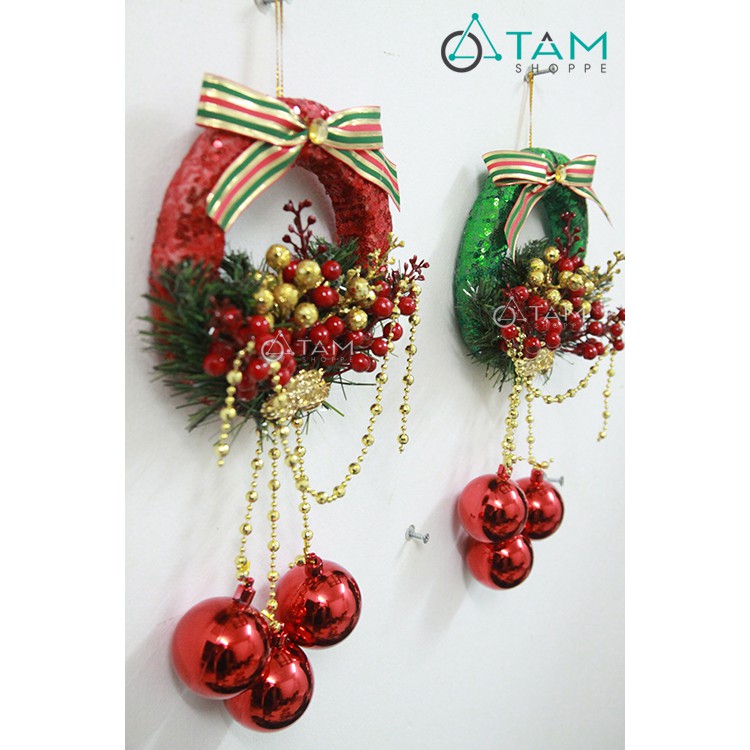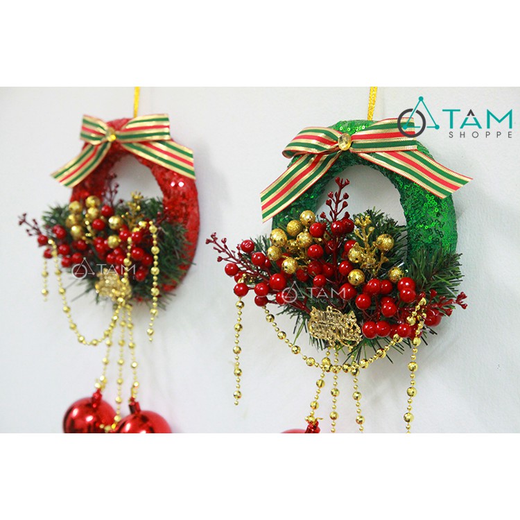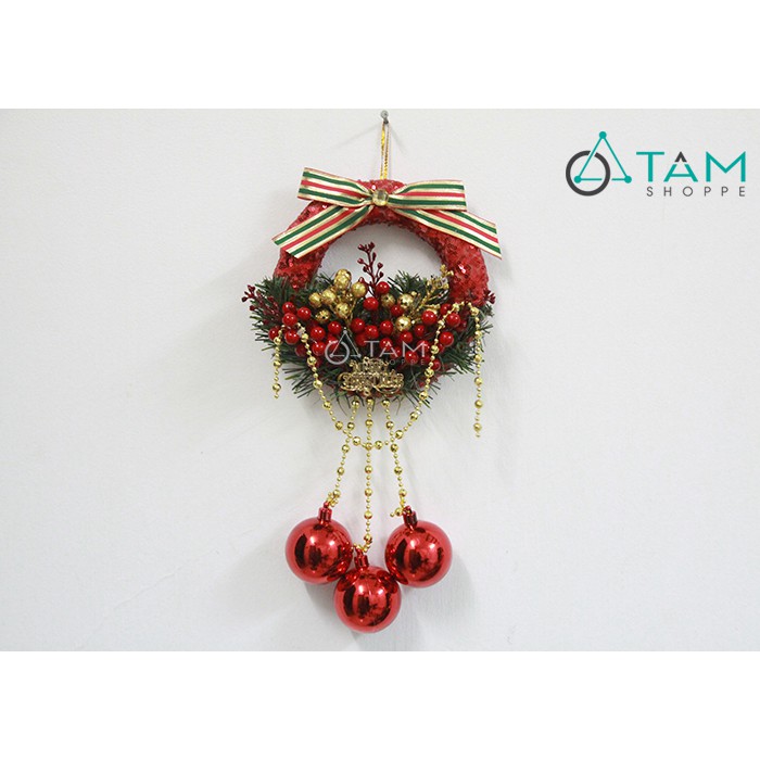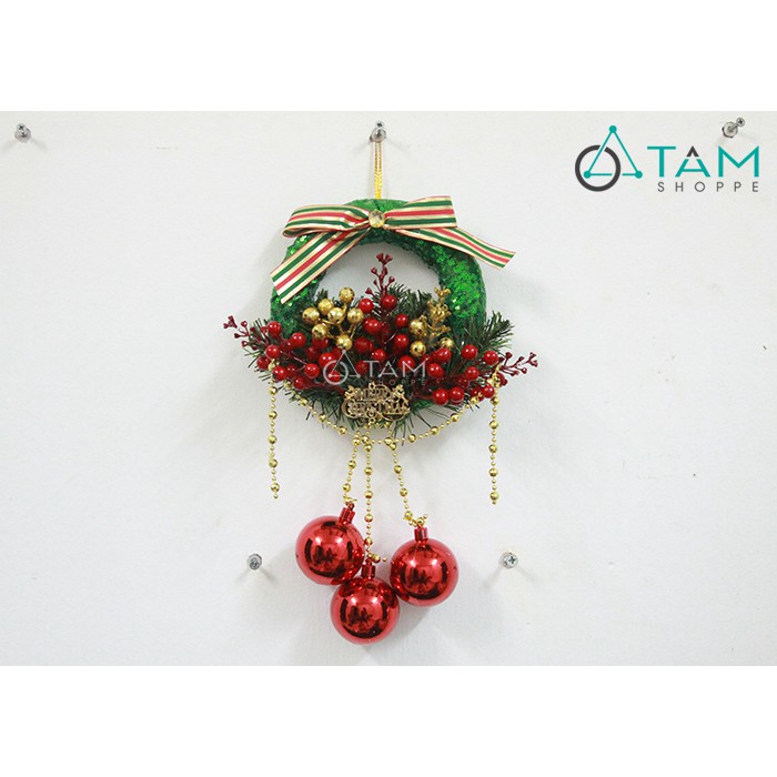 - Chất liệu: Vòng xốp quấn vải kim sa, phụ kiện handmade Noel