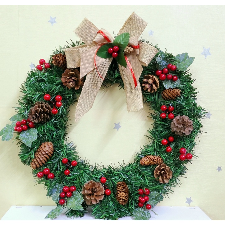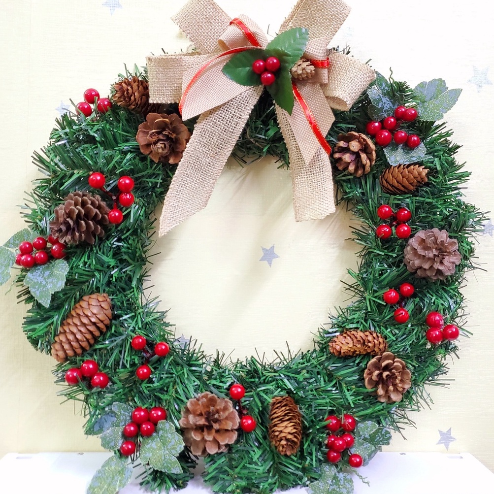 ** Chất liệu: lá thông giả , hoa lá giả kèm 1 số phụ kiện trang trí khác** Kích thước: đường kính 40cm, 30cm