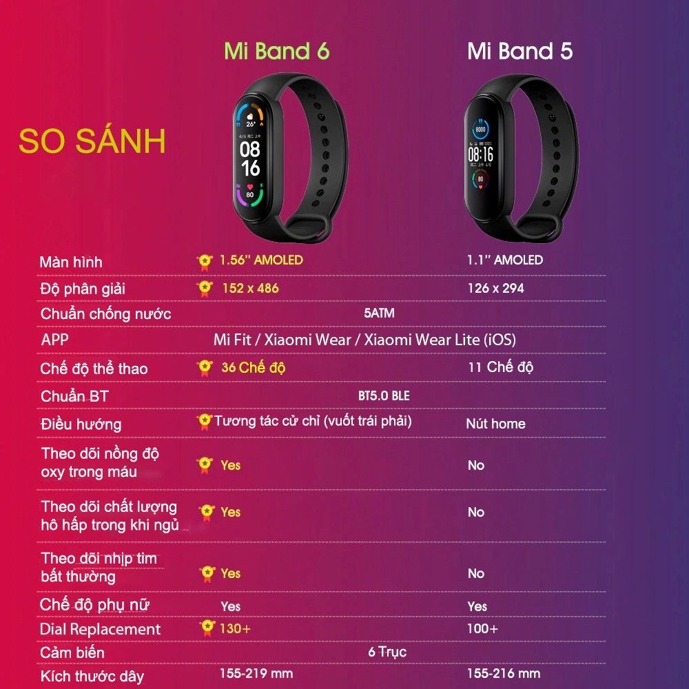 Đặc điểm chính vòng tay Miband:1. Màn hình màu kích thước lớn, tăng 20% diện tích hiển thị so với mi band 5, mi band 6 tăng hơn 100 giao diện hiển thị.