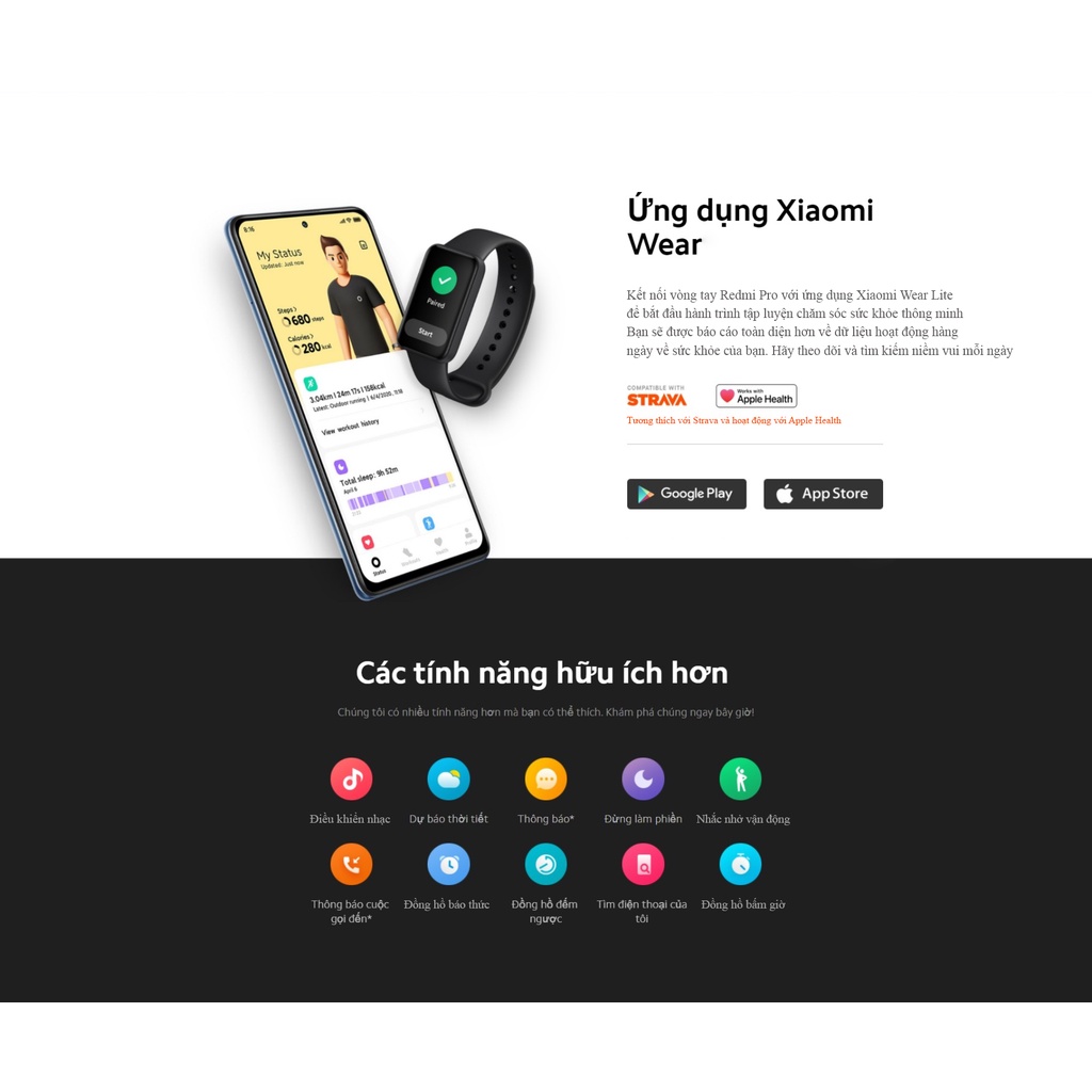 Redmi Smart Band Pro hỗ trợ các ứng dụng như Strava và Apple Health, có thể đo mức độ căng thẳng và cung cấp chức năng theo dõi kinh nguyệt cho chị em phụ nữ. Vòng đeo cũng có tính năng theo dõi giấc ngủ nhờ cảm biến đo nhịp tim 24/7, cũng như đo nồng độ oxy trong máu nhờ SpO2.