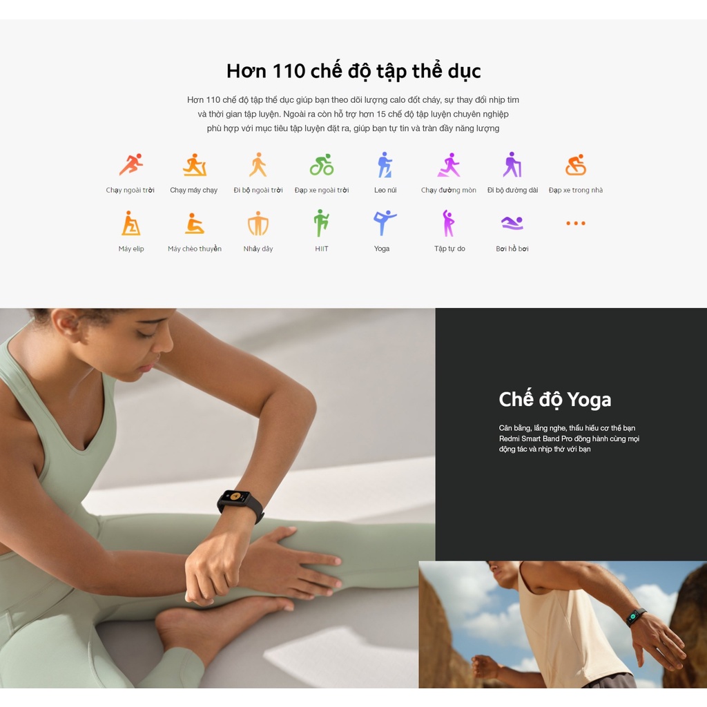 Redmi Smart Band Pro có đầy đủ các tính năng hữu ích mà người dùng mong đợi ở một vòng đeo thông minh. Thiết bị hỗ trợ theo dõi hơn 100 chế độ tập luyện thể thao khác nhau, điển hình trong số đó có chạy bộ, đạp xe, bơi lội và yoga.
