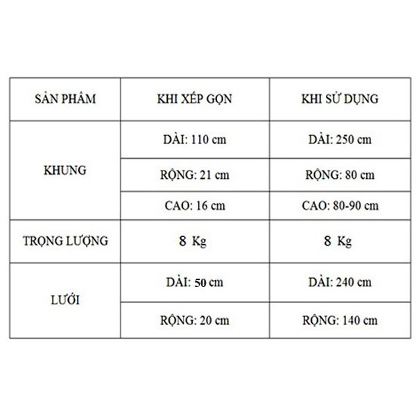 – Kích thước khung: Dài 220-240 x Rộng max 80cm x cao 90cm; trọng lượng khoảng 8kg