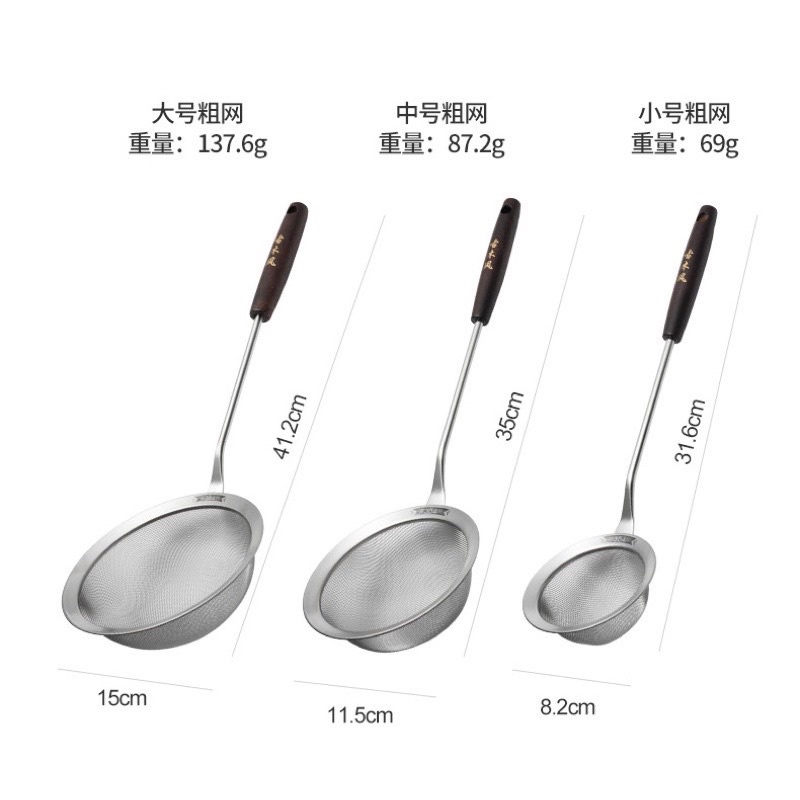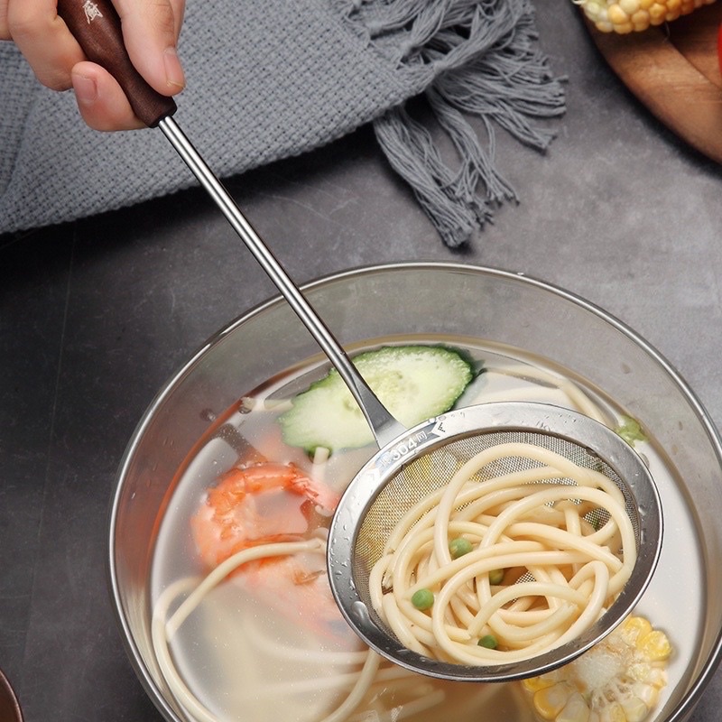 Vợt hớt bọt, vợt lọc dầu, vợt vớt cặn bã inox mờ 304 Xuất Khẩu Nhật cán Gỗ Khắc Cổ Điển