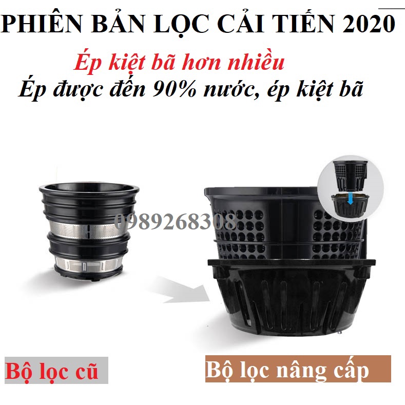 Phiên bản cải tiến nhất 2021: Bộ lọc cải tiến giúp ép kiệt bã lên tới 96%, tốc độ ép chậm chỉ với 43 vòng/phút, độ ồn thấp chỉ 40-50 dB, 2 đầu vào vật liệu ép gồm cổ bình to 86 mm & cổ bình nhỏ giúp thích hợp với nhiều vật liệu ép