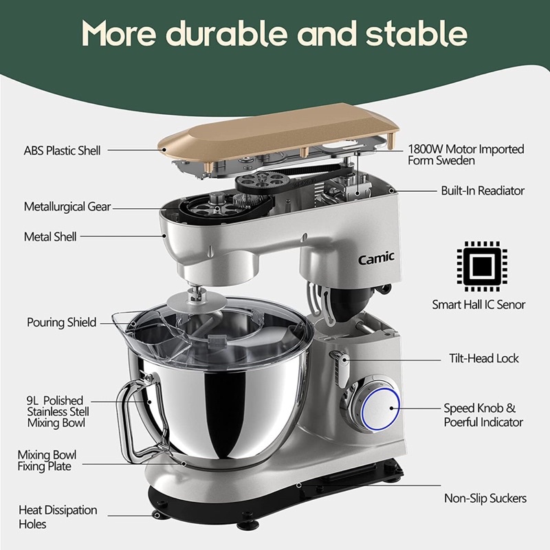 Sản phẩm: Máy nhào bột CAMIC 9L động cơ 1800W với kết cấu bánh răng kim loại bền bỉ có thể nhào được 1.2 kg bột khô phù hợp với các gia đình hay hộ kinh doanh nhỏ.