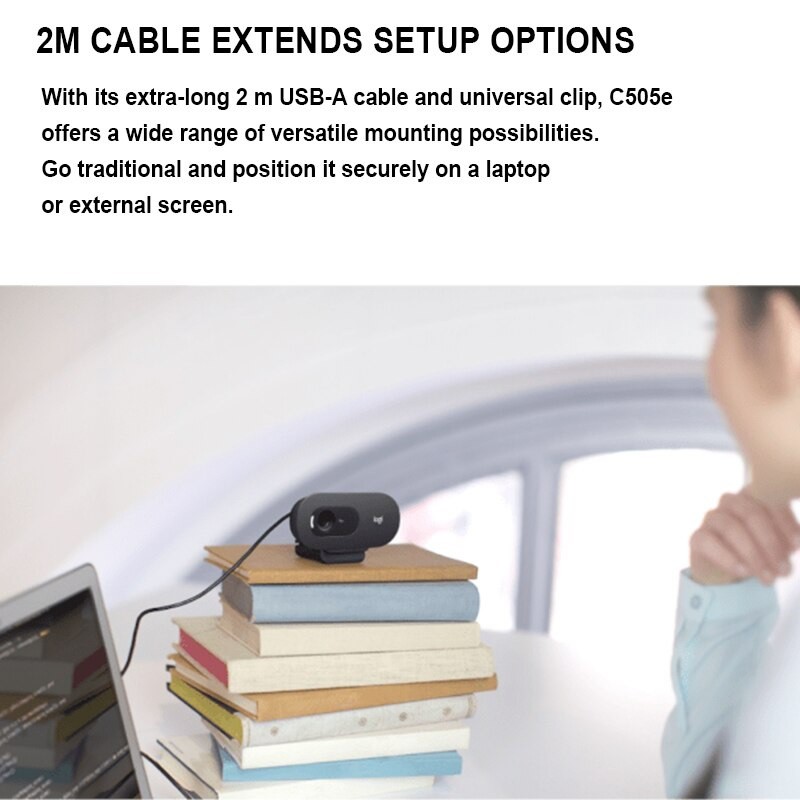 Với dây USB-A siêu dài 2m và kẹp phổ dụng, C505 đem đến nhiều khả năng gắn linh hoạt. Áp dụng cách truyền thống là gắn cố định trên máy tính xách tay hoặc màn hình ngoài, hay sáng tạo bằng cách gắn lên giá hoặc cố định ở khoảng cách 2m so với máy tính.