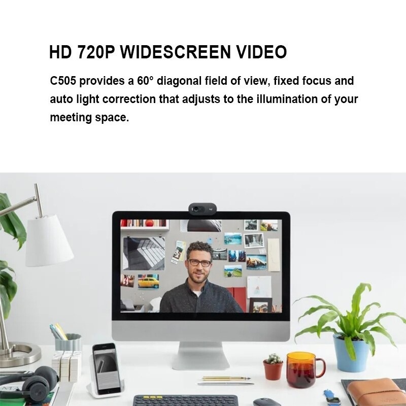 - Webcame Logitech C505e này đem lại chất lượng video sắc nét nhờ tích hợp thiết lập quang học từ máy tính, độ phân giải màn hình rộng 720p HD/30 fps mang lại hình ảnh rực rỡ mượt mà, mang đến tầm nhìn đến 60 độ, khả năng lấy nét cố định và điều chỉnh ánh sáng tự động theo ánh sáng không gian của bạn