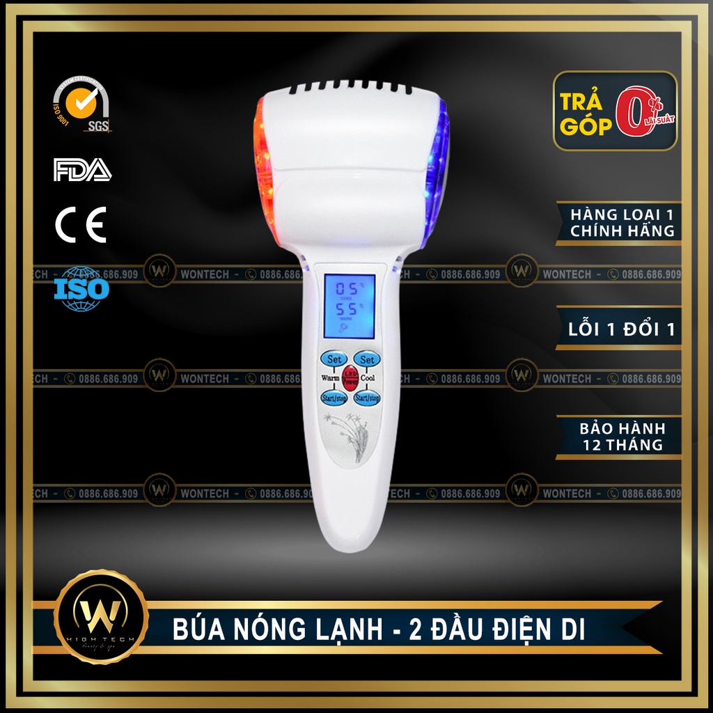 ***Búa nóng lạnh Ion ánh sáng sinh học trẻ hóa da 2 đầu là thiết bị SPA với công nghệ chăm sóc da hoàn toàn mới. Sản phẩm với 2 tính năng với 2 đầu nóng lạnh riêng biệt hỗ trợ lẫn nhau. Một đầu nóng có mức độ nóng là từ 30-55°C giúp kích thích tăng tuần hoàn máu, đưa dưỡng chất vào tận sâu bên trong tế bào. Một đầu lạnh có nhiệt độ là 5-25°C giúp se khít lỗ chân lông, thu hẹp tiết diện tế bào cho serum tinh chất hấp thụ nhanh và sâu đồng thời giảm nhăn, nâng cơ mặt và làm căng bóng da hiệu quả