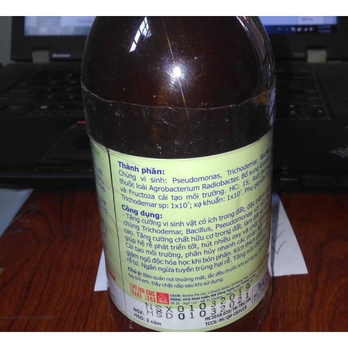 Thành phần: Chủng vi sinh: Pseudomonas, Trichoderma, Bacillus thuộc loài Agrobacterium Radiobacter. Bổ sung Glucoza và Fructoza cải tạo môi trường. HC: 15; Axit Humic. Trichoderma sp: 10.000.000bt; xạ khuẩn: 10.000.000bt. Phụ gia vừa đủ