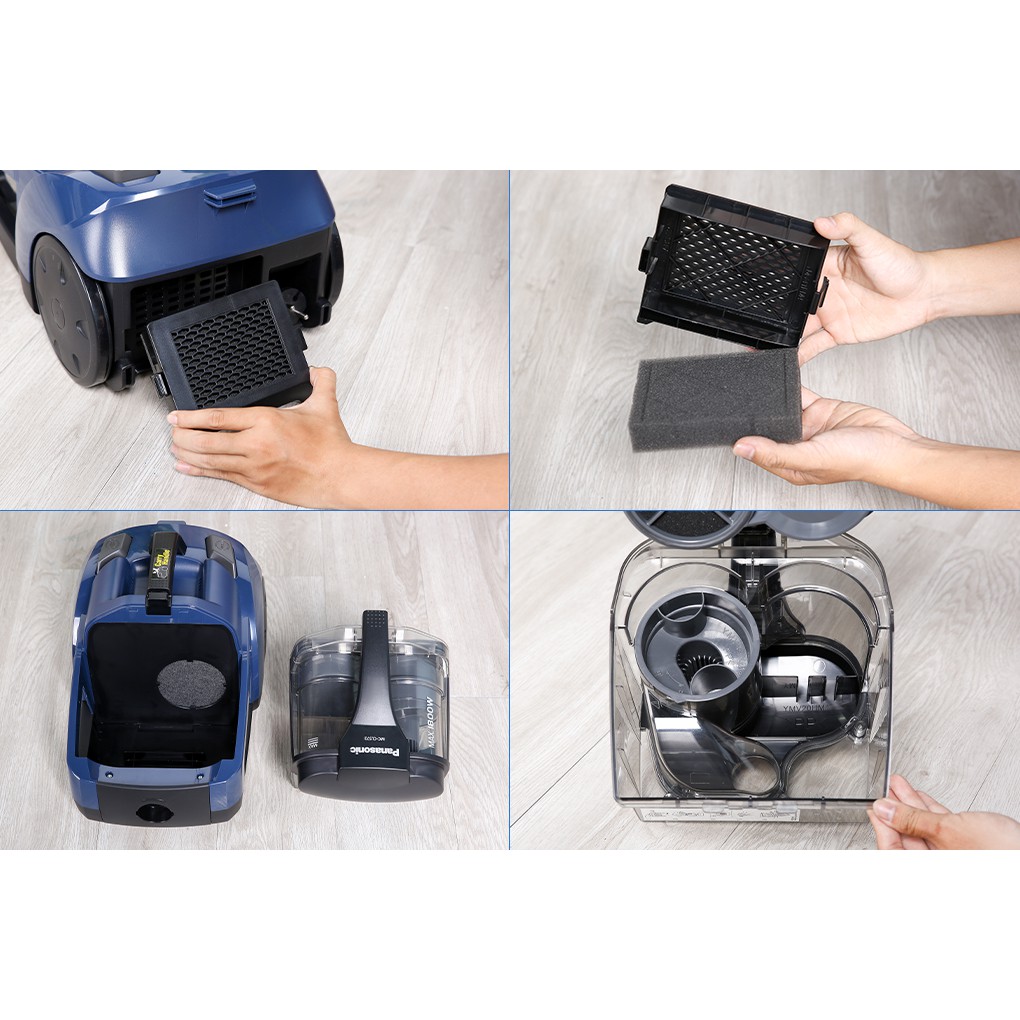 ● Máy hút bụi Panasonic có màu xanh đen tinh tế, sang trọng, kích cỡ gọn nhẹ cùng thiết kế bánh xe giúp di chuyển linh hoạt, nhanh chóng● Máy có hộp chứa bụi dung tích lớn 2.2 lít, chứa được lượng bụi lớn, người dùng không cần phải đổ bụi nhiều lần, tiết kiệm thời gian, công sức