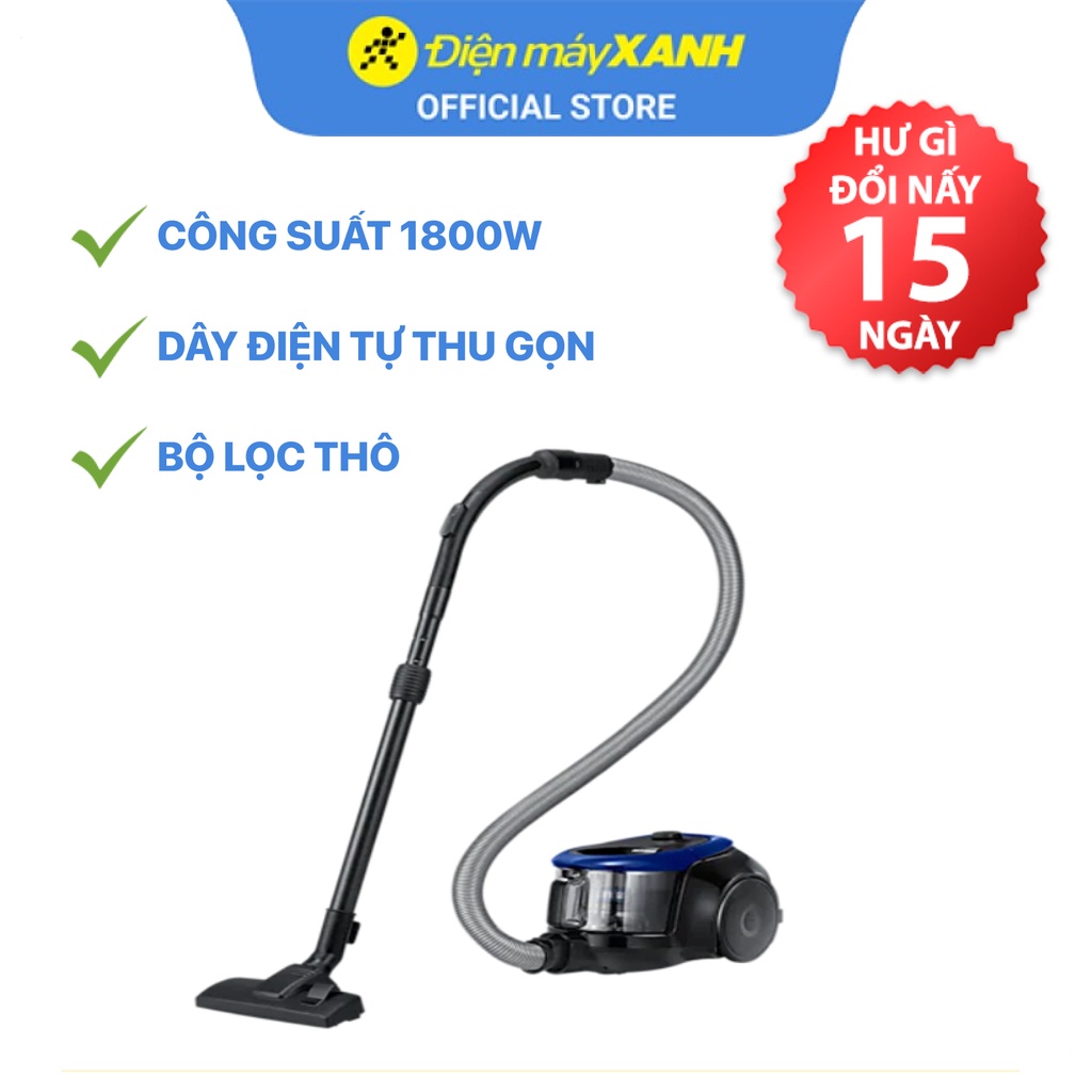 Máy hút bụi Samsung VC18M2120SB/SV của thương hiệu Samsung nổi tiếng Hàn Quốc, sản xuất tại Việt Nam, mẫu mã hiện đại, công suất lớn 1800W, công nghệ hút hiện đại, hộp chứa bụi đến 1.5 lít, mang đến khả năng hút nhanh, làm sạch nhà cửa dễ dàng.