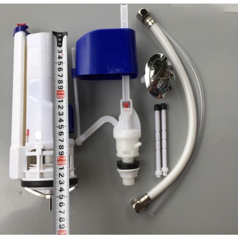Bộ đầy đủ bao gồm: Dây cấp, zoăng cao su,bu lông nhựa, hai nút nhấn gắn lên nắp két và các phụ kiện như trong hình