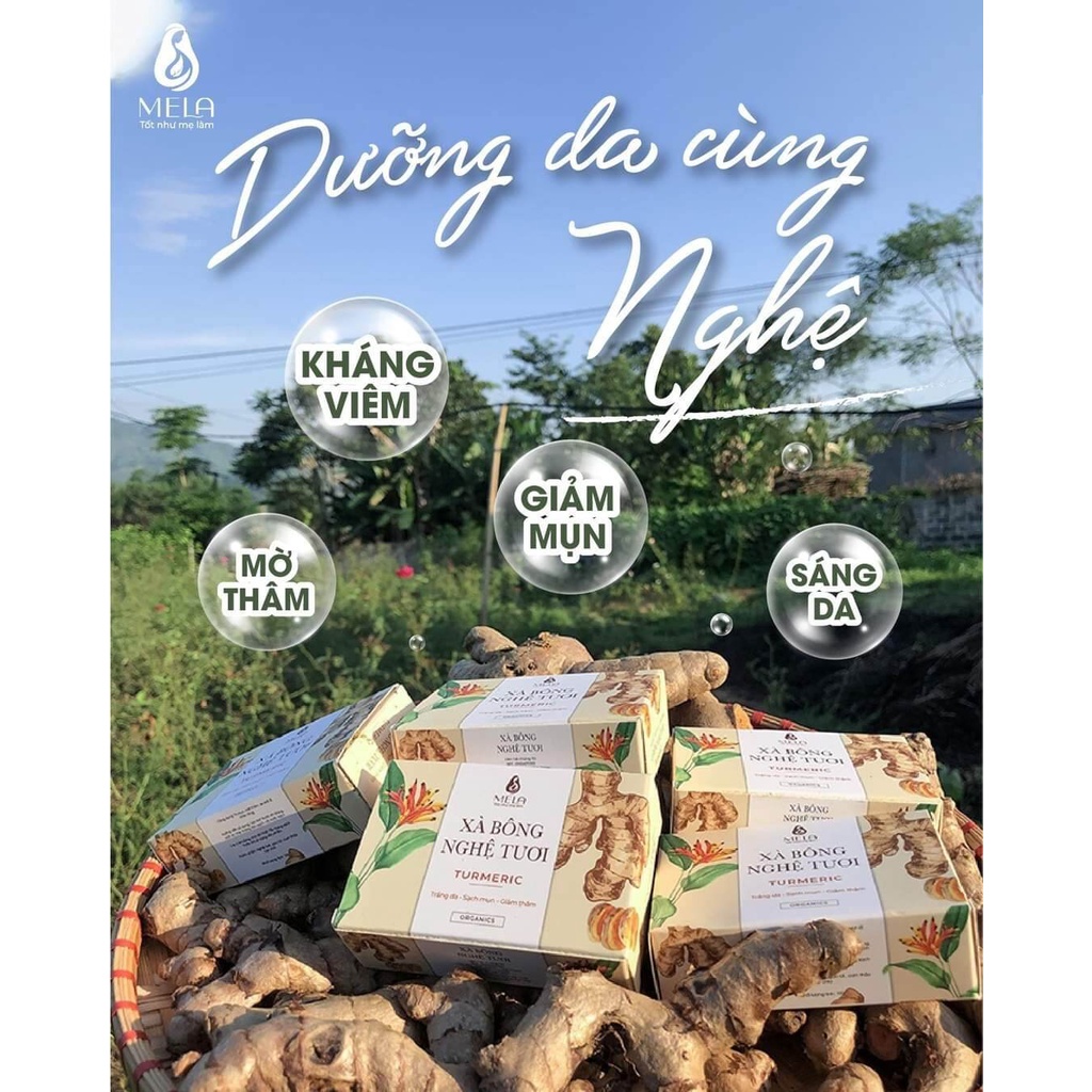- Xà bông nghệ mela giúp làm sạch da, chống lão hóa da, giảm mụn giảm thâm nám, tăng cường độ ẩm, nhanh liền sẹo và xà phòng nghệ tươi bảo vệ da.