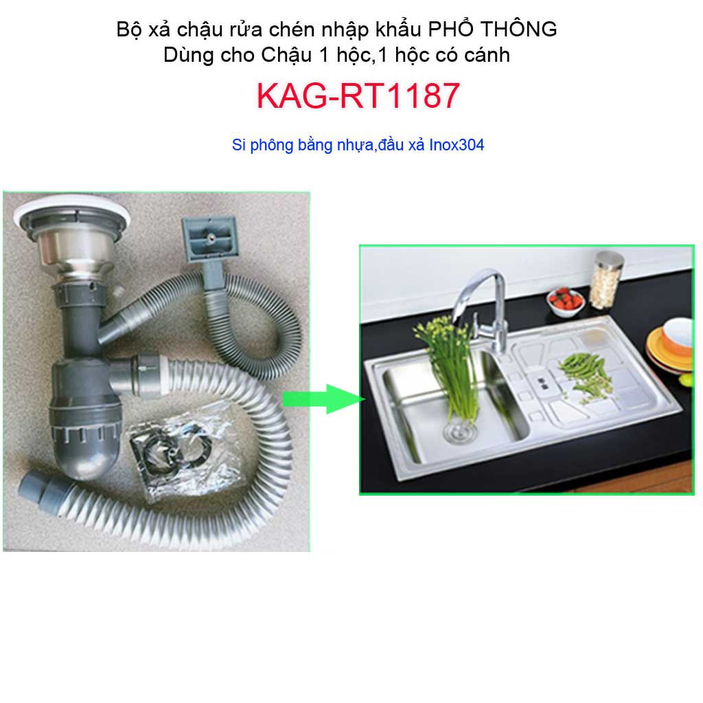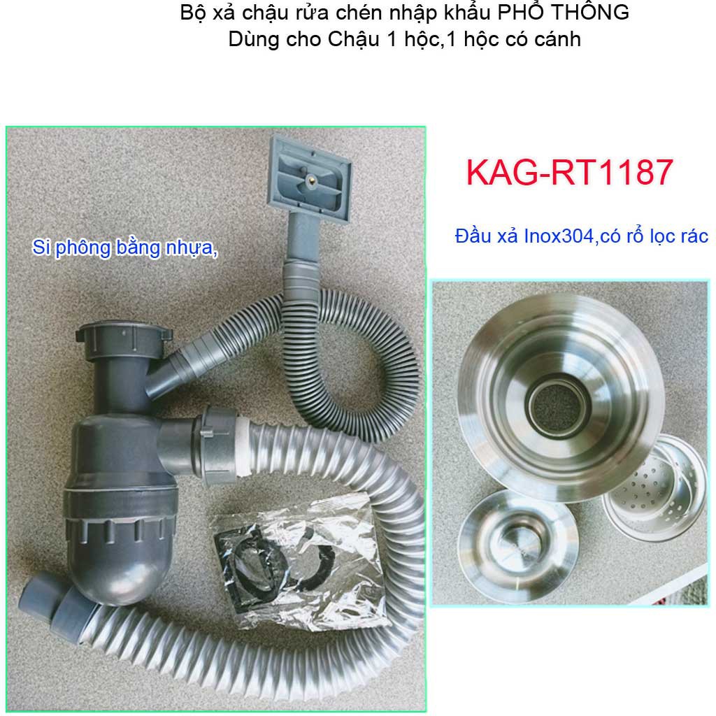 Bộ xả chậu chén bát 1 hố trọn bộ, ống xả xi phông chậu rửa chén bát 1 hộc KAG-RT1187Bộ xả chậu chén bát 1 hố trọn bộ, ống xả xi phông chậu rửa chén bát 1 hộc KAG-RT1187: Bầu xả bằng inox 304 11cm, ống xi phông bằng nhựa, bộ xi phông có bầu lắng chông hôi và bám cặn.