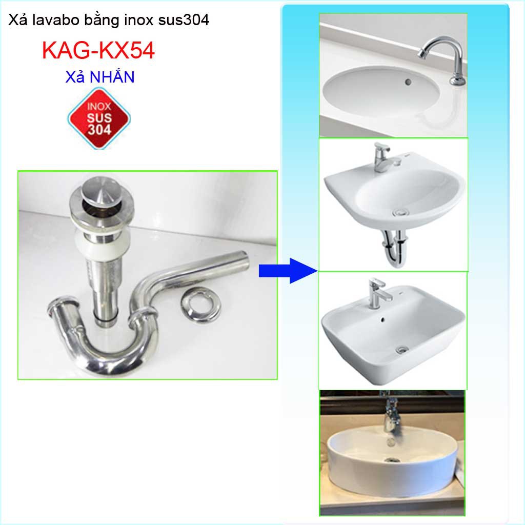 Ưu điểm: Xả chậu lavabo Inox SUS304, bộ xả nhấn lavabo cao cấp KAG-KX54 độ bền cao, xả nhấn, ống thải chữ P ngăn mùi hôi thoát từ ống lên lavabo