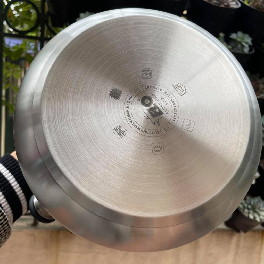 - Đáy ấm được thiết kế 3 lớp dạng "Caspsulated Bottom" truyền nhiệt nhanh, tản nhiệt đều có thể thấy rõ ở hình dưới đây: Lớp trên cùng bằng inox 304 không nhiễm từ tính sẽ tiếp xúc trực tiếp với nước; lớp lõi bằng nhôm quang học có tác dụng giúp nhiệt lượng tản đều rộng khắp đáy ấm; lớp dưới cùng của đáy nồi làm bằng từ inox 304 nhiễm từ tính nên bếp có thể nấu được trên cả bếp từ. Chính cấu tạo 3 lớp như trên giúp các sản phẩm của Elo nói chung và ấm Elo Bombee nói riêng có cơ chế tản nhiệt ưu việt hơn, không nóng cháy cục bộ dưới đáy nồi, tiết kiệm thời gian đun nấu và cả tiền bạc cho gia đình