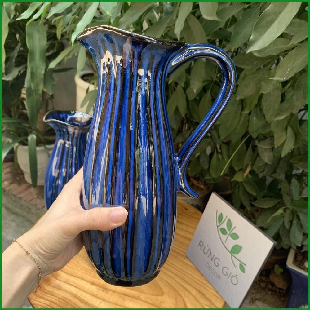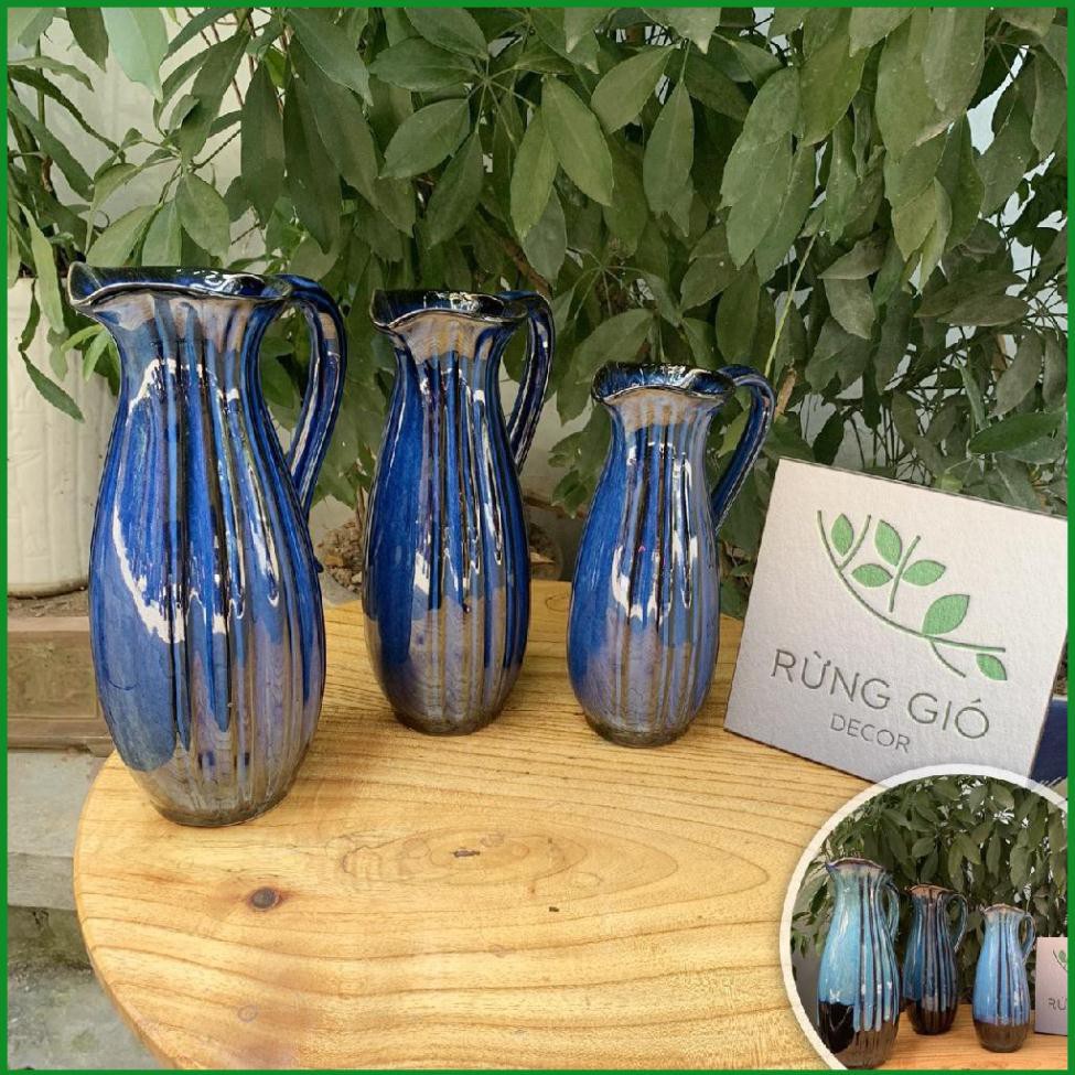 Mã 50: lọ xanh coban hoặc xanh biển, men hỏa biến có quai dáng dài, cao 29cm, miệng rộng tầm 9cm, giá 180k