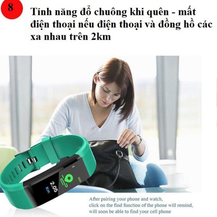 Đồng hồ thông minh Smart band 115Plus giúp đo nhịp tim, huyết áp, theo dõi lượng oxy trong máu, đo bước đi (cảm biến 3D), lượng calo tiêu thụ, khoảng cách đi được, kết nối Bluetooth, nhắc nhở cuộc gọi, nhắc nhở thông tin, kích hoạt màn hình bằng cách giơ tay, đồng hồ báo thức thông minh, chế độ tìm vòng tay, chụp ảnh từ xa, nhắc nhở ít vận động, theo dõi giấc ngủ, lưu ý thông tin (SMS, Wechat, QQ, Facebook, Twitter, WhatsAPP, vv)