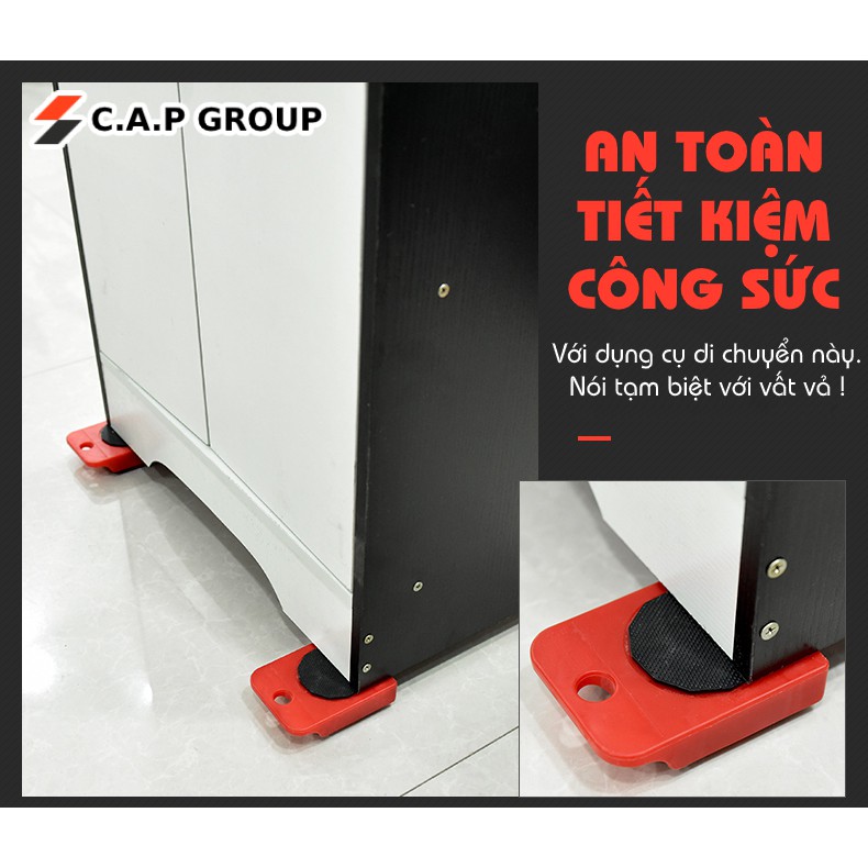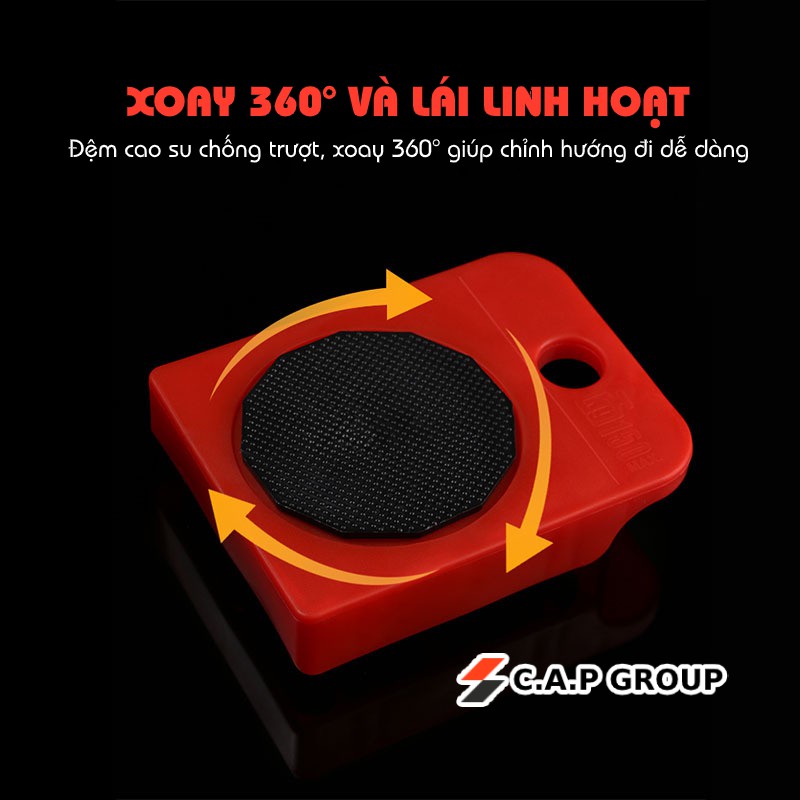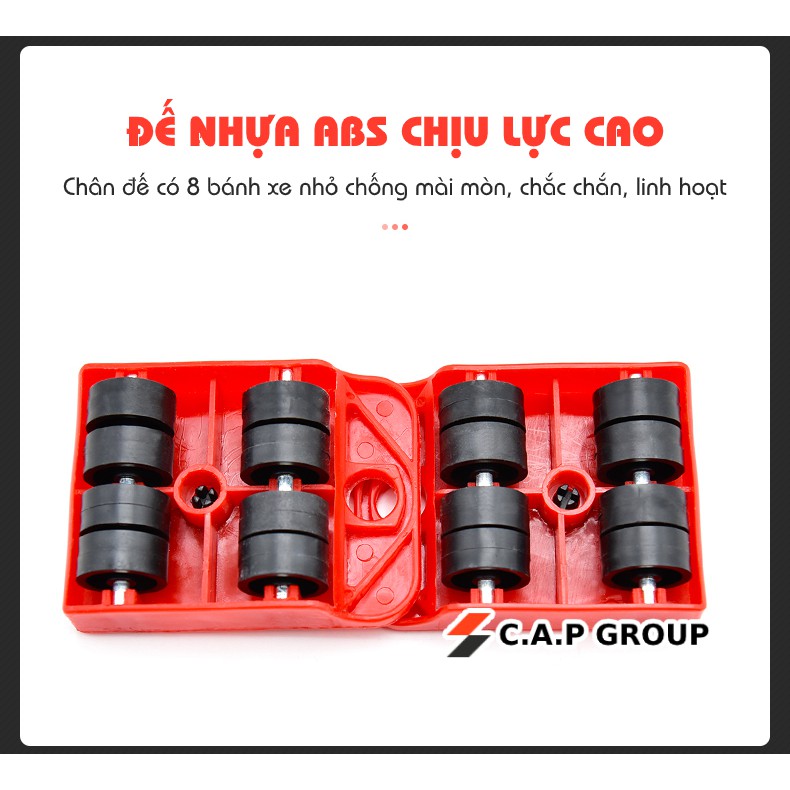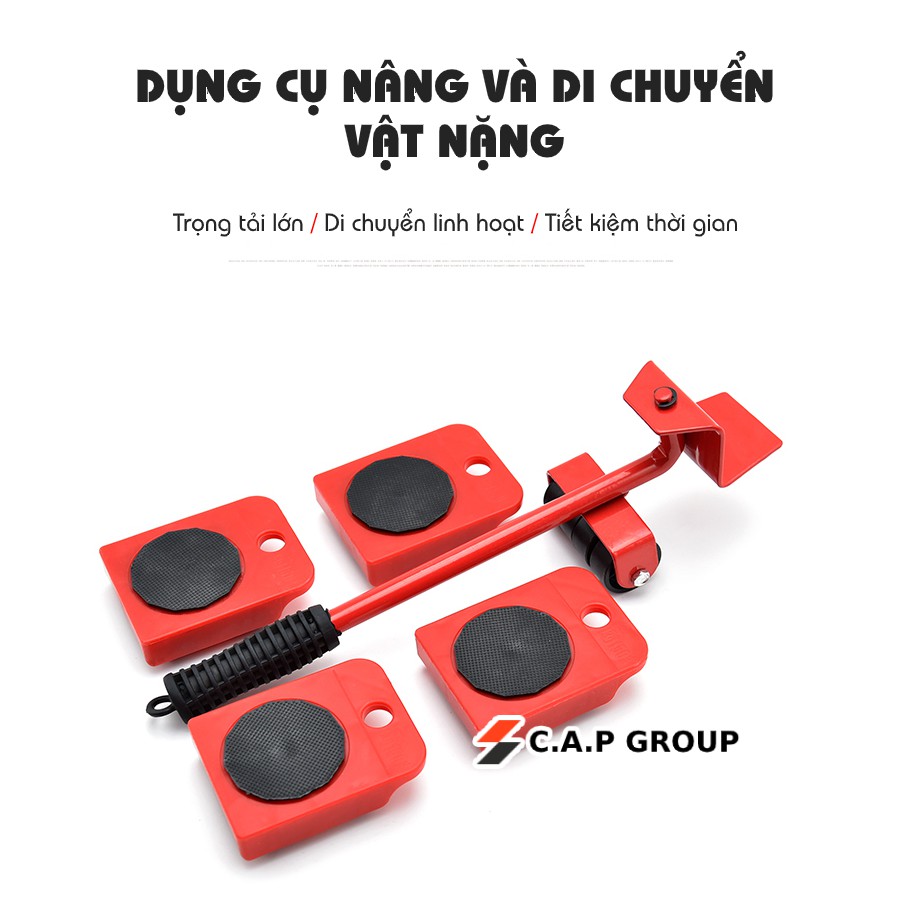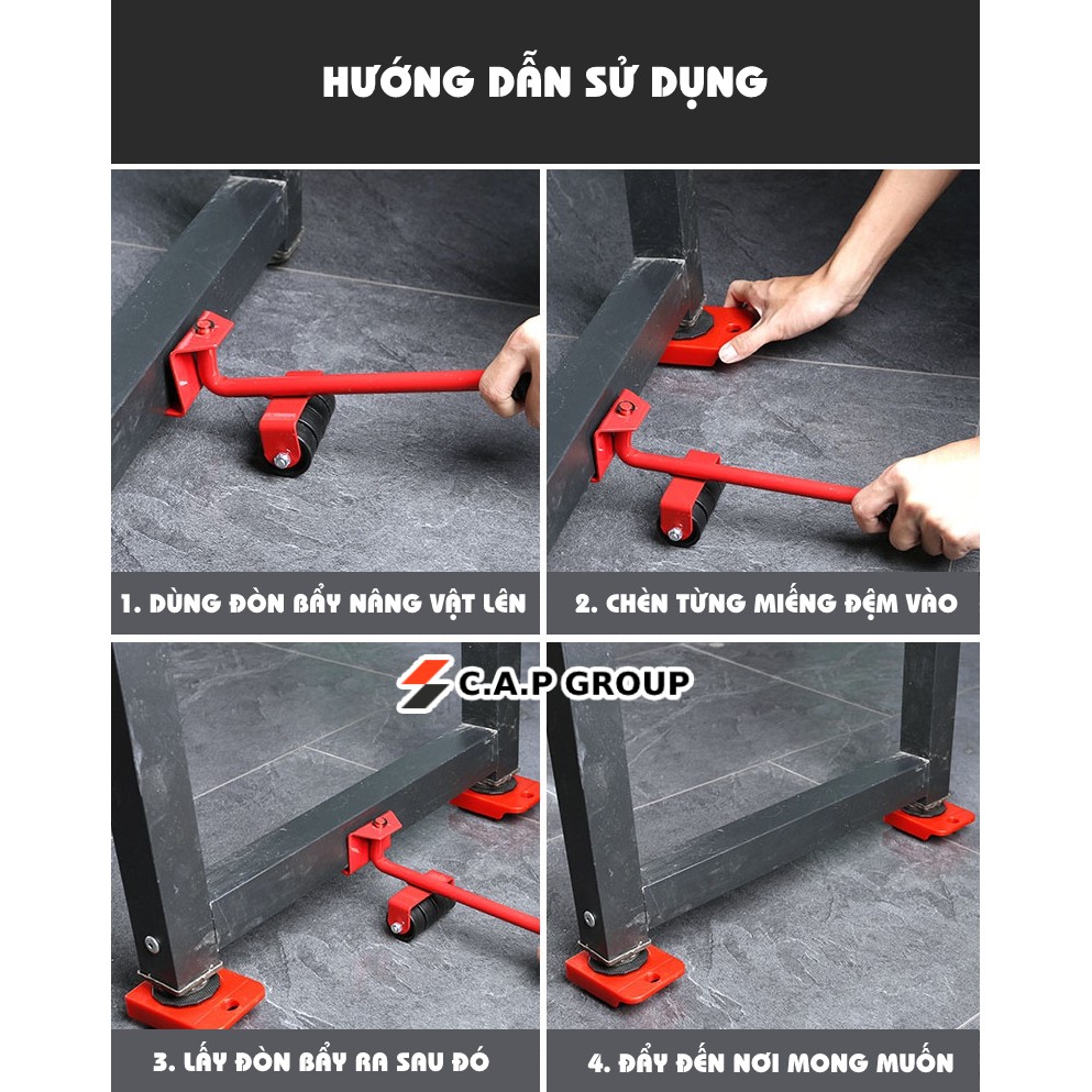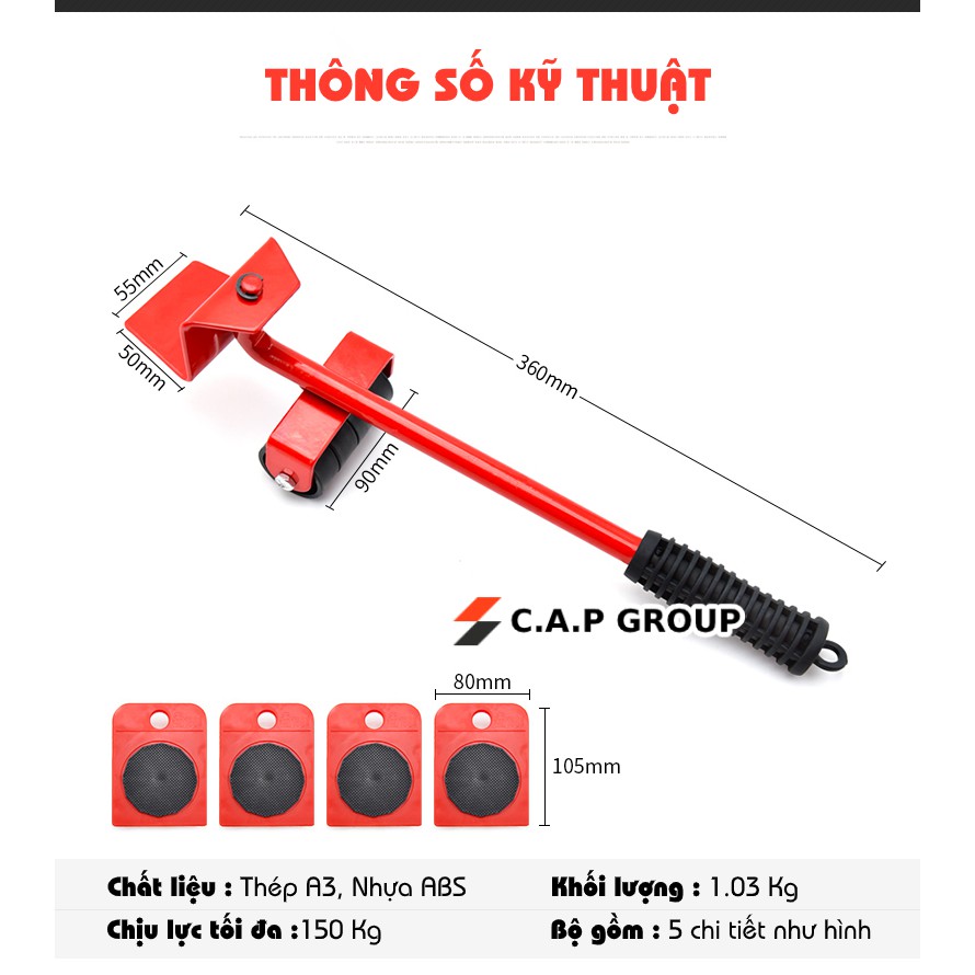 - Bộ sản phẩm bao gồm một tay nâng và hệ 4 con lăn. Tay nâng được làm từ chất liệu thép siêu cứng và siêu bền. Con lăn với các bánh xe được làm từ nhựa ABS chịu lực cao, có khả năng xoay 360 độ giúp bạn dễ dàng di chuyển vật dụng đến đúng vị trí mình mong muốn..