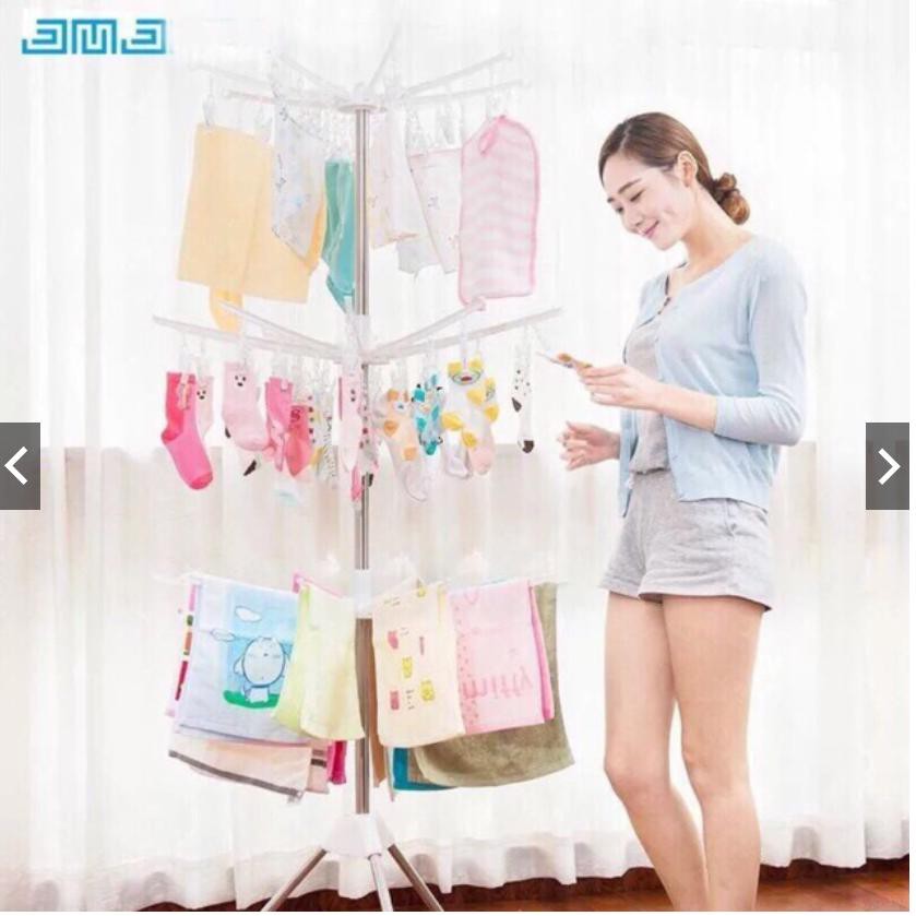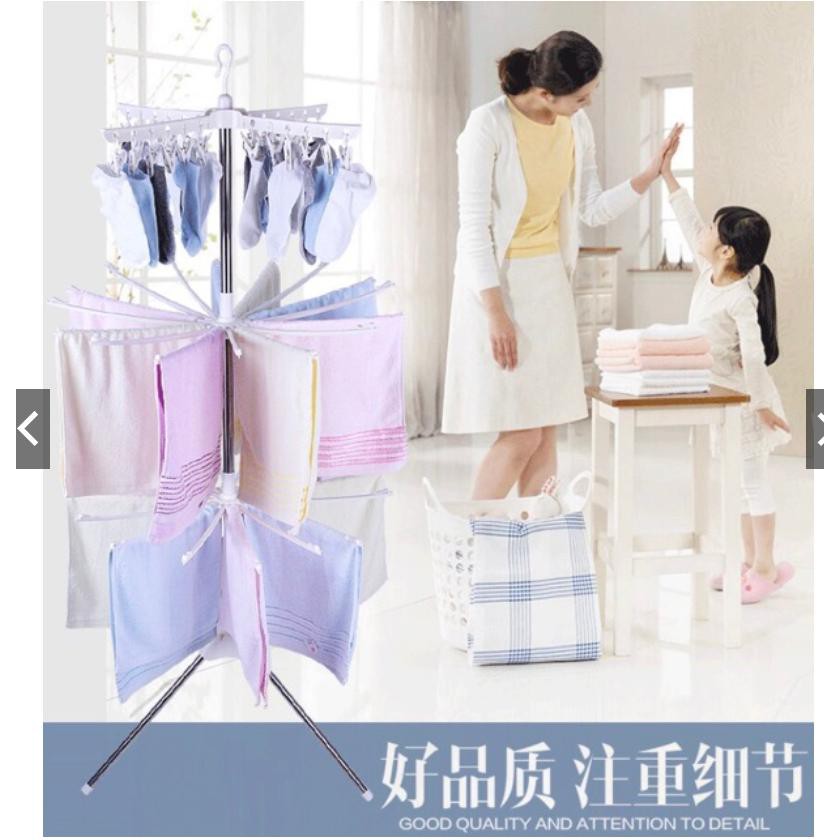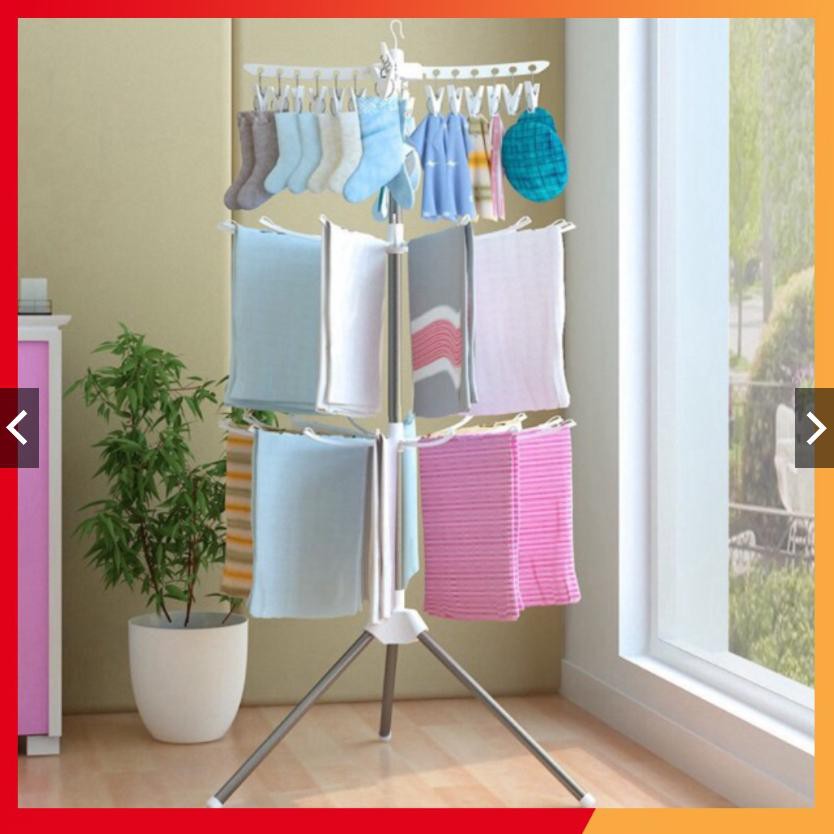 - Cây phơi quần áo 3 tầng với 3 giá phơi đồ cực kì chắc chắn và tiện dụng, có thể gập gọn khi không sử dụng, móc trùm có thể tháo rời làm 1 móc treo tác biệt