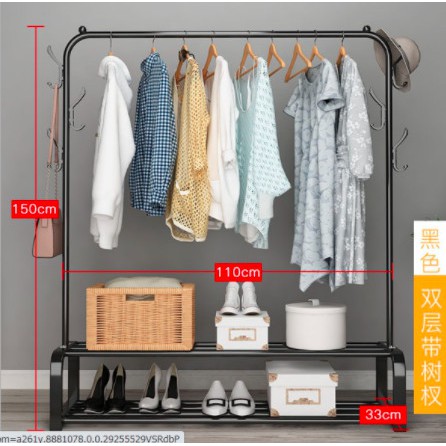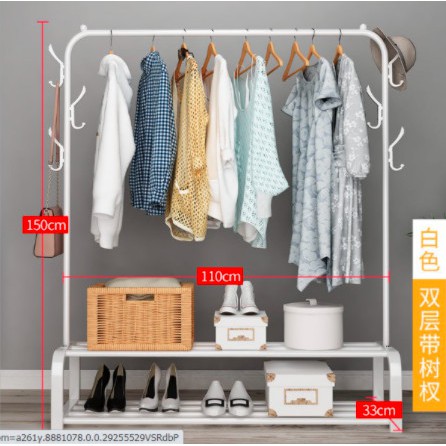 Gía treo quần áo thiết kế thêm 1 tầng có các thanh sắt ngang để đồ, ngoài việc treo quần áo còn có thể để được rất nhiều vật dụng lên tầng dưới của kệ áo như : Giày dép, túi sách, ba lô...