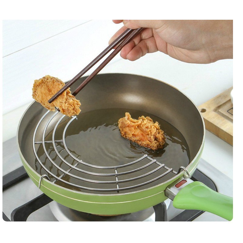Vỉ gác chảo rán với thiết kế đơn giản nhưng khá tiện ích, giúp bạn đặt thức ăn đã chiên rán lên trên gác cho món ăn luôn thơm ngon, nóng giòn.