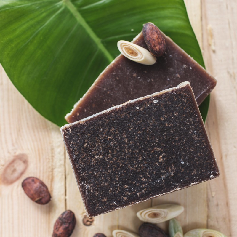 Thành phần: Bơ ca cao, dầu olive, dầu nành, dầu hạt cải, dầu dừa, dầu hướng dương, thầu dầu, dầu mù u, nước cất, NaOH, bột ca cao, tinh dầu sả.