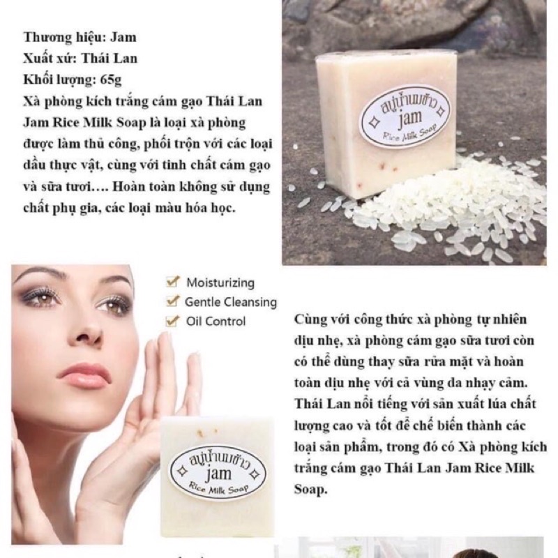 Xà phòng làm trắng cám gạo Thái Lan Jam Rice Milk Soap là loại xà phòng được làm organic với các loại dầu thực vật, cùng với tinh chất cám gạo và sữa tươi…. Hoàn toàn không sử dụng chất phụ gia, các loại màu hóa học.