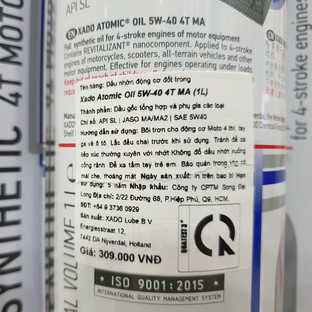 XADO Atomic Oil 5W-40 4Т MA Super Synthetic is dầu nhớt tổng hợp hoàn toàn thế hệ mới nhất với cấp nhớt SAE 5W-40 dành cho động cơ xe 4 th. Đáp ứng được những yêu cầu cao nhất dành cho dầu động cơ xe máy (JASO MA).Dầu gốc cho XADO Atomic 5W-40 4T MA được sản xuất trên cơ sở các loại dầu gốc tổng hợp phức tạp từ dầu North Sea và các phụ trợ đặc biệt