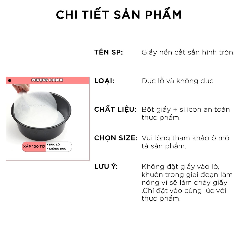 Xấp 100 tờ giấy nến cắt sẵn đục lỗ và không đục hình tròn dùng cho nồi chiên không dầu hoặc lót khuôn bánh là sản phẩm tiện lợi mà bất cứ ai làm bánh hoặc dùng nckd đều nên có. Giấy cắt sẵn giúp bạn đỡ tốn thời gian và tiết kiệm hơn. Chỉ cần vài chục nghìn bạn có thể sử dụng cả trăm lần.THÔNG TIN SẢN PHẨM