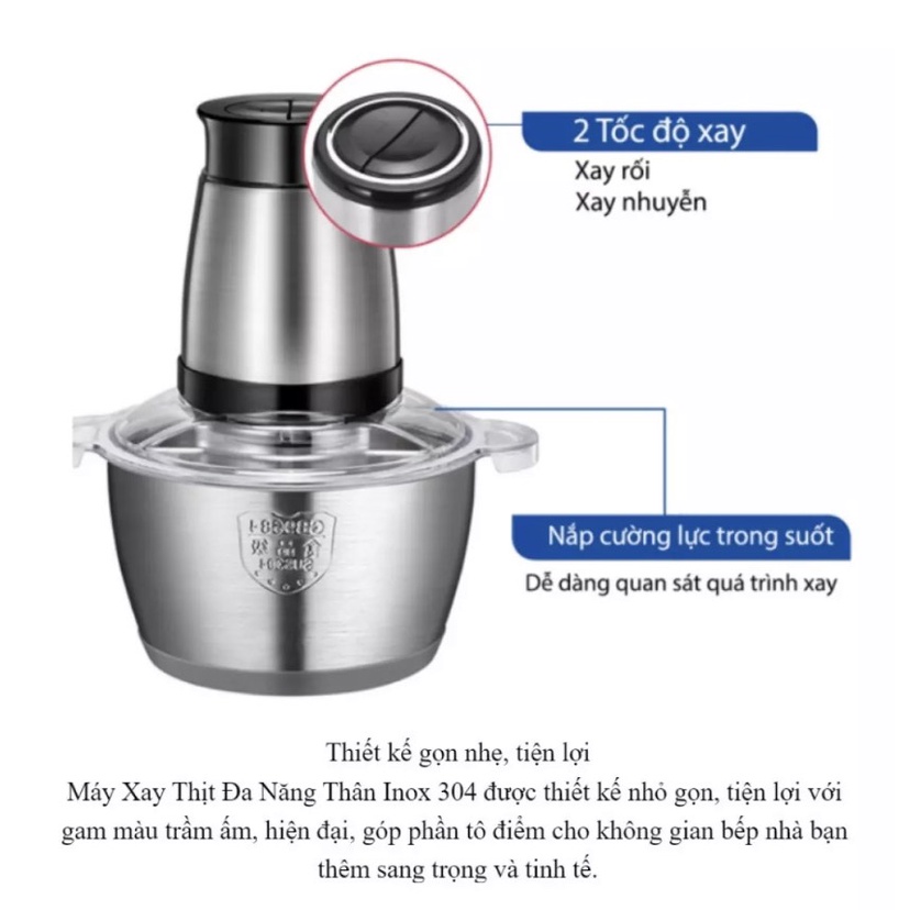 [XAY GÌ CŨNG ĐƯỢC] Máy Xay Thịt Cối INOX 304, Máy Xay Thịt Bằng Điện Không Rỉ, Dung Tích Lớn 2L, Công Suất 300W