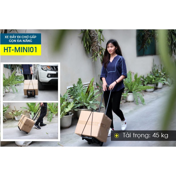 - Xe đẩy đi chợ gấp gọn đa năng HT-MINI01 được làm từ chất liệu nhựa nên rất nhẹ nhàng, siêu gọn. Trọng lượng nhẹ chỉ 1,3 kg và có thể gấp gọn lại khi không sử dụng nên rất tiện lợi. Tải trọng của xe lên tới 45kg giúp bạn thoải mái mua sắm.
