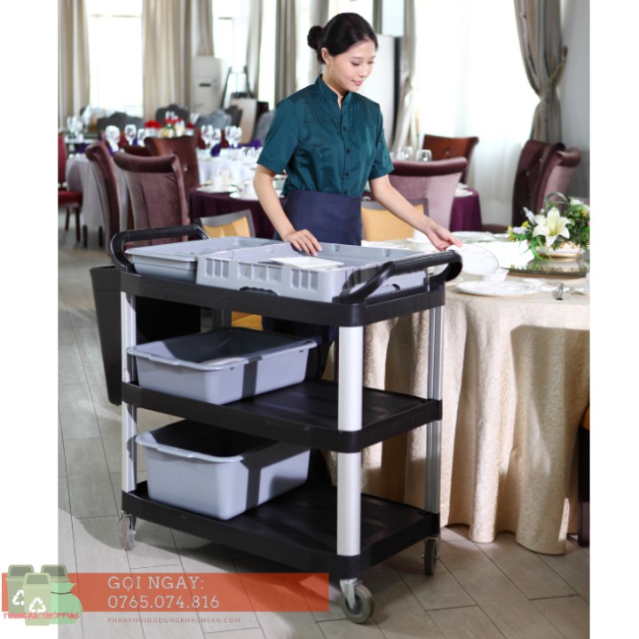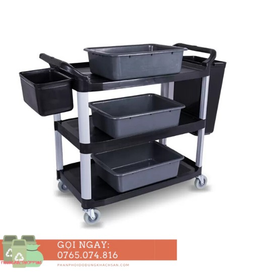 XE ĐẨY DỌN THỨC ĂN 3 TẦNG BẰNG NHỰA L-010 - MÀU ĐEN (Chưa xô, thau)