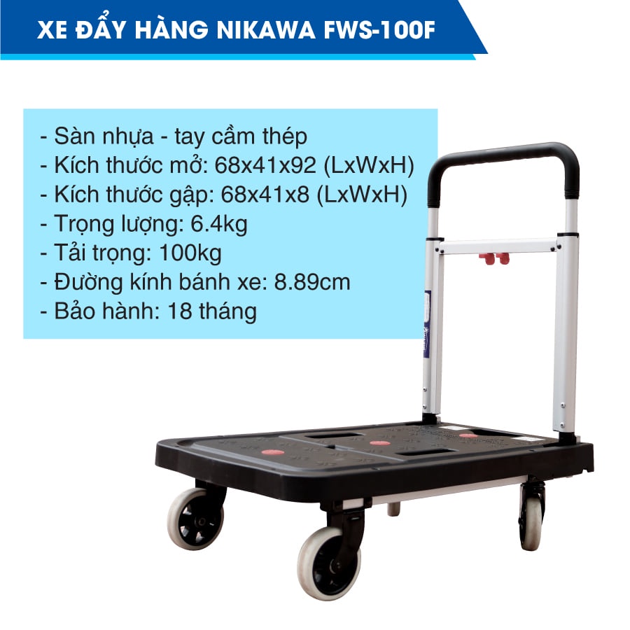 2. Thông số kỹ thuật của Xe đẩy hàng, xe kéo hàng Nikawa FWS-100F, 4 bánh, tải trọng 100kg, sàn nhựa, bảo hành chính hãng 18 tháng.