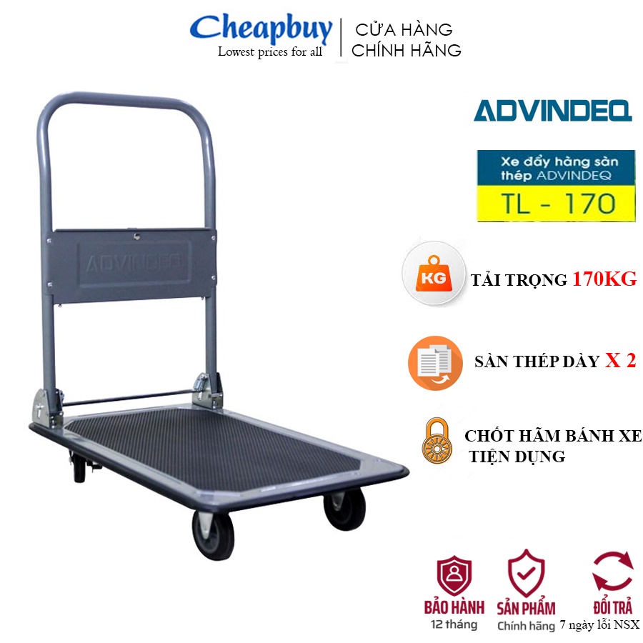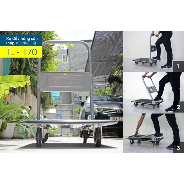 - Sản phẩm Xe kéo đẩy hàng 4 bánh sàn thép ADVINDEQ TL-170 có thể gấp gọn tay đẩy hỗ trợ cho việc vận chuyển các loại hàng hóa nặng (lên tới 170kg). Phù hợp sử dụng trong các nhà kho, siêu thị, nhà máy, sân bay, bến bãi …chuyên chở hàng hóa nặng, giảm thiểu tối đa sức lao động cho con người.