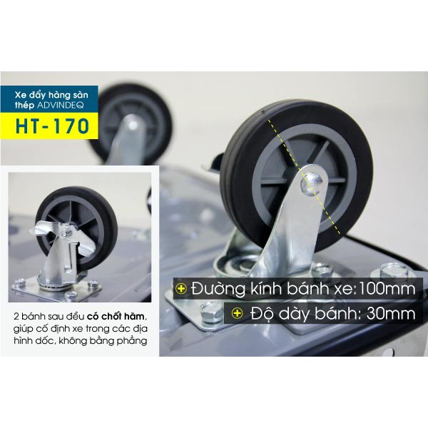 Xe đẩy hàng 4 bánh sàn thép ADVINDEQ TL-170, tải trọng 170kg.Tiếp nối thành công của dòng xe đẩy hàng 4 bánh gấp gọn TL-150, TL-300, Advindeq đã cho ra mắt các dòng xe đẩy sàn thép 4 bánh mới với màu sắc, chất liệu, tính năng và tải trọng chở hàng mới, 1 trong số đó là dòng xe TL-170 được ra mắt với chất liệu thép sơn tĩnh điện màu ghi xám, sơn chống gỉ xước chịu tải tốt hơn các dòng khác