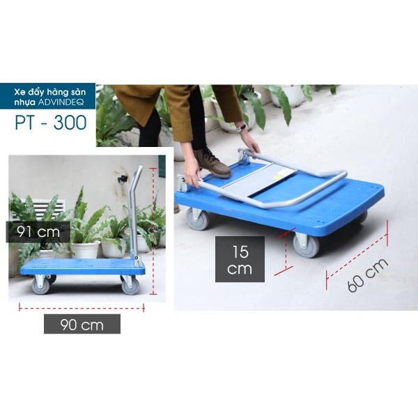 - Xe đẩy hàng sàn nhựa Advindeq PT-300 chính hãng mang đầy đủ các đặc tính nổi trội thương hiệu Advindeq Đài Loan. Kích cỡ nhỏ nhắn chỉ 12kg nhưng khả năng chịu tải lên tới 300 ~ 320 kg, thiết kế chắc chắn từ thép cao cấp, an toàn và tính cơ động rất cao, hơn nữa còn có thể gấp gọn nhằm tiết kiệm không gian lưu trữ. Xe đẩy hàng sàn nhựa PT-300 là một sự lựa chọn hoàn hảo cho các văn phòng, cửa hàng, nhà kho,…